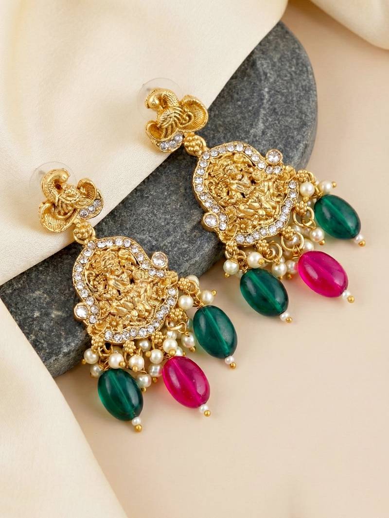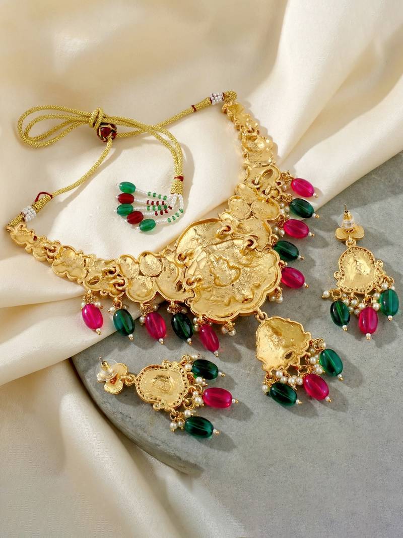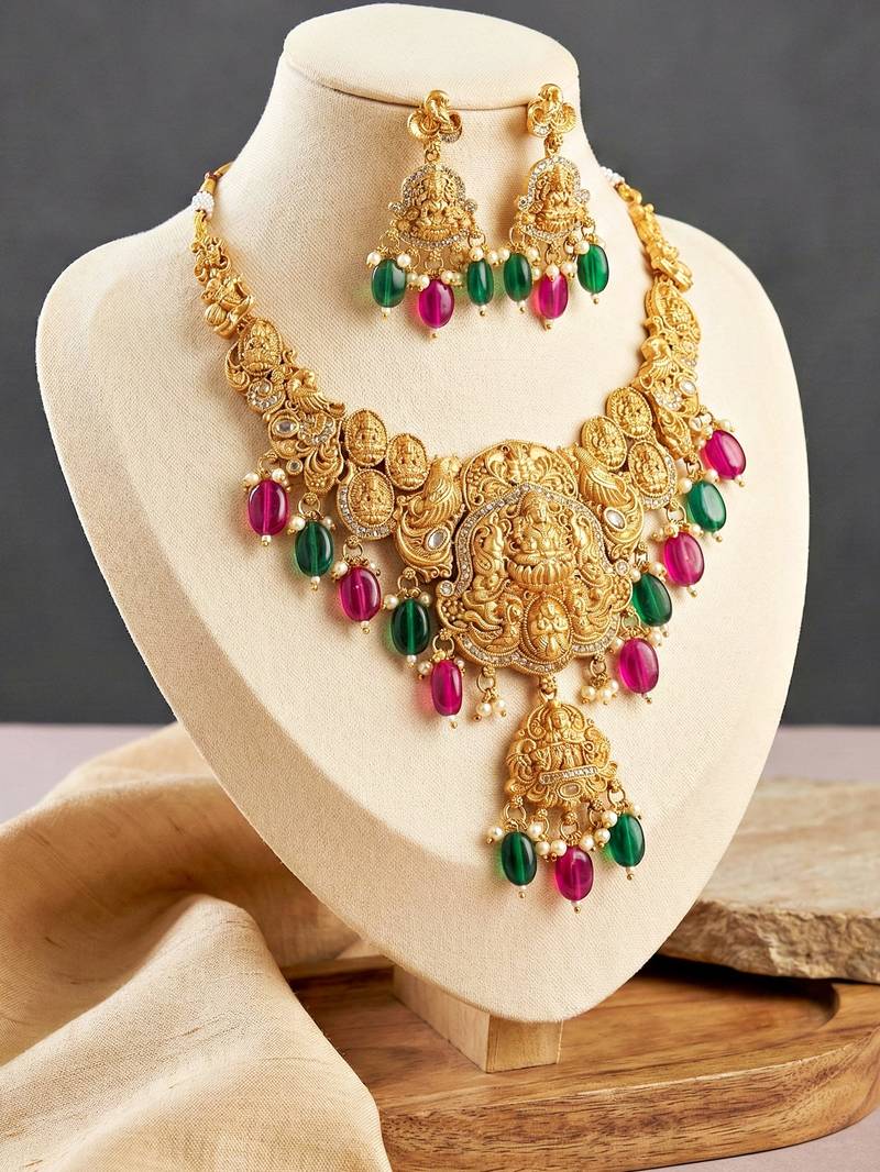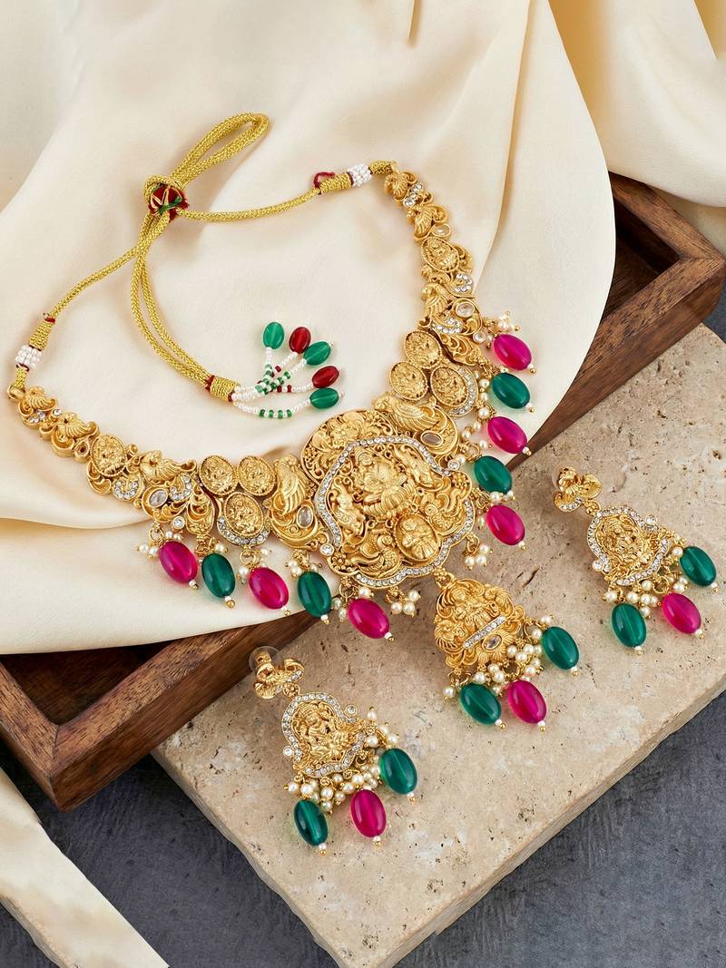 | Product Description | Make A Grand Statement With This Exquisitely Crafted Temple Style Bridal Necklace Set From Lucky Jewellery. Featuring A Rich Antique Gold Tone Finish, This Necklace Showcases Intricate Temple Motifs Inspired By Traditional Indian Craftsmanship, Highlighted With Detailed Figurine Work And Elegant Stone Accents. The Necklace Is Beautifully Adorned With Colored Bead Drops And Moti Detailing, Adding Depth, Movement, And A Regal Charm. Paired With Matching Earrings, This Set Is Designed For Weddings, Bridal Functions, Festive Occasions, And Traditional Ceremonies, Making It A Perfect Choice For Special Celebrations. With Its Premium Finish And Ornate Detailing, This Jewellery Set Pairs Effortlessly With Bridal Sarees, Silk Outfits, Lehengas, And Traditional Ethnic Wear, Offering A Timeless And Majestic Look That Stands Out. |