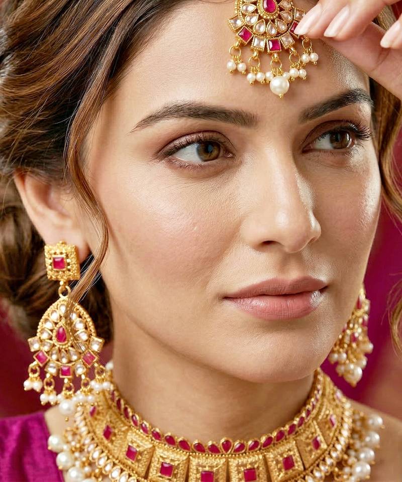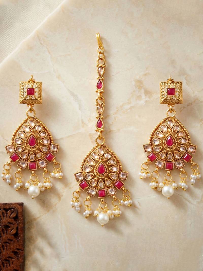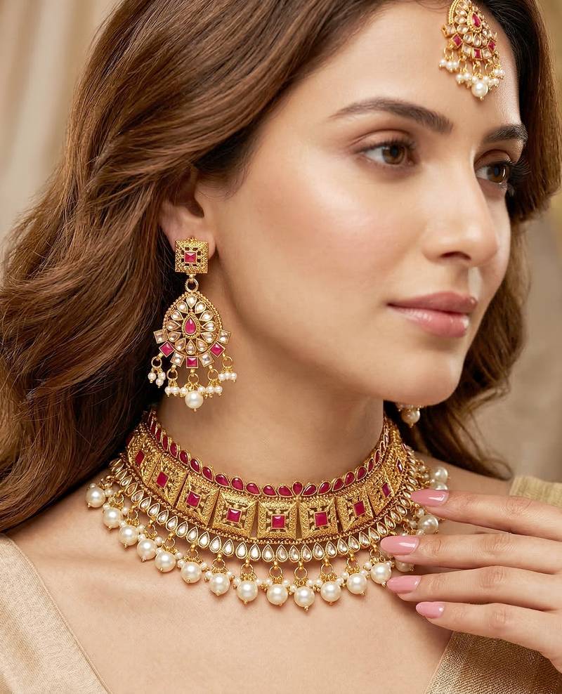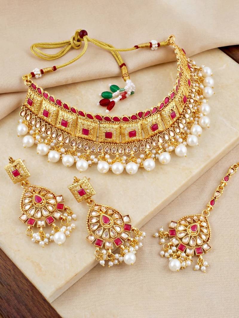 | Product Description | Gold Plated Choker Necklace Set With Ruby Color Stones And Pearl Drops. Includes Matching Earrings And Maang Tikka, Perfect For Weddings And Festive Occasions. |
