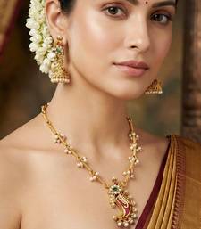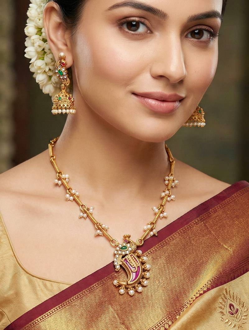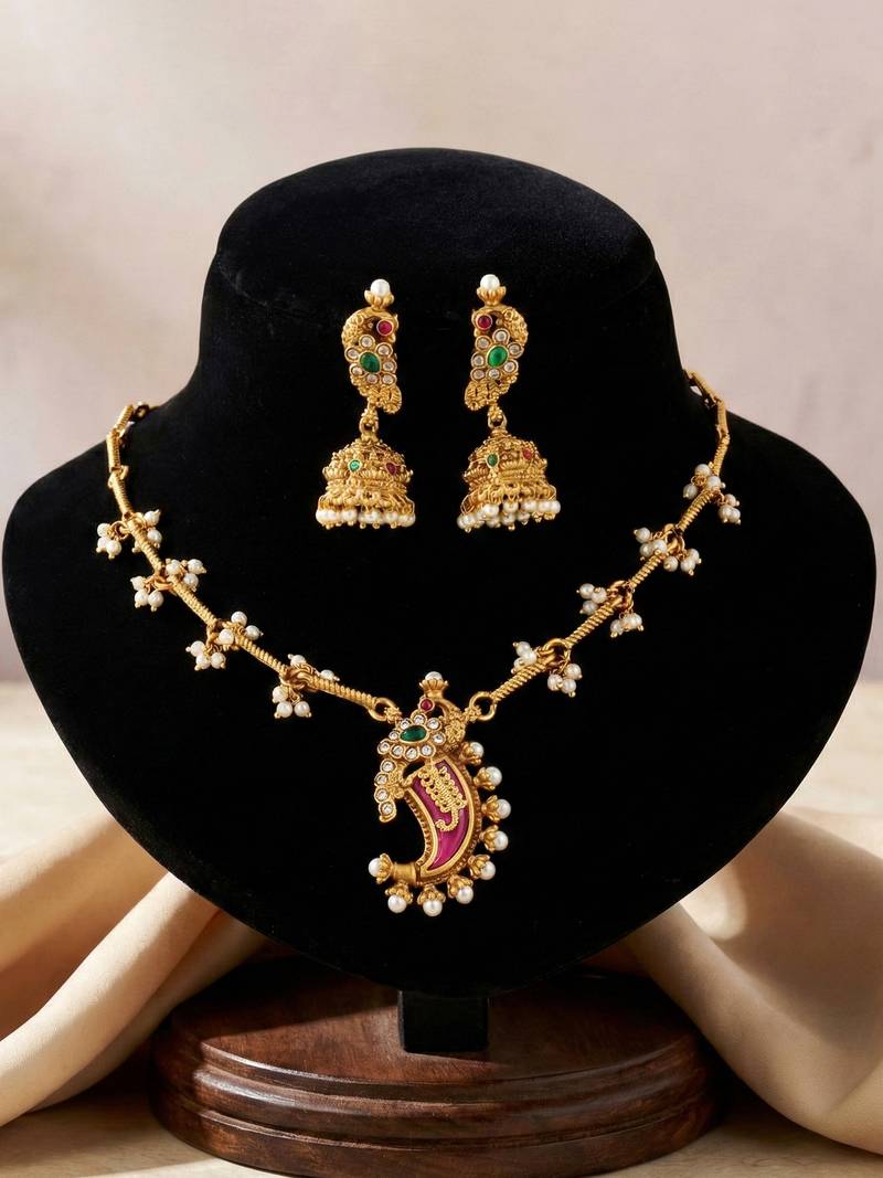 | Product Description | Add Timeless Ethnic Elegance To Your Jewellery Collection With This Beautifully Designed Gold Tone Paisley Pendant Necklace Set With Jhumka Earrings. Inspired By Classic Temple Jewellery Aesthetics, The Centerpiece Features An Intricately Crafted Paisley Motif Highlighted With Rich Pink Enamel Detailing And Accented By Vibrant Green Stones For A Striking Traditional Look. |