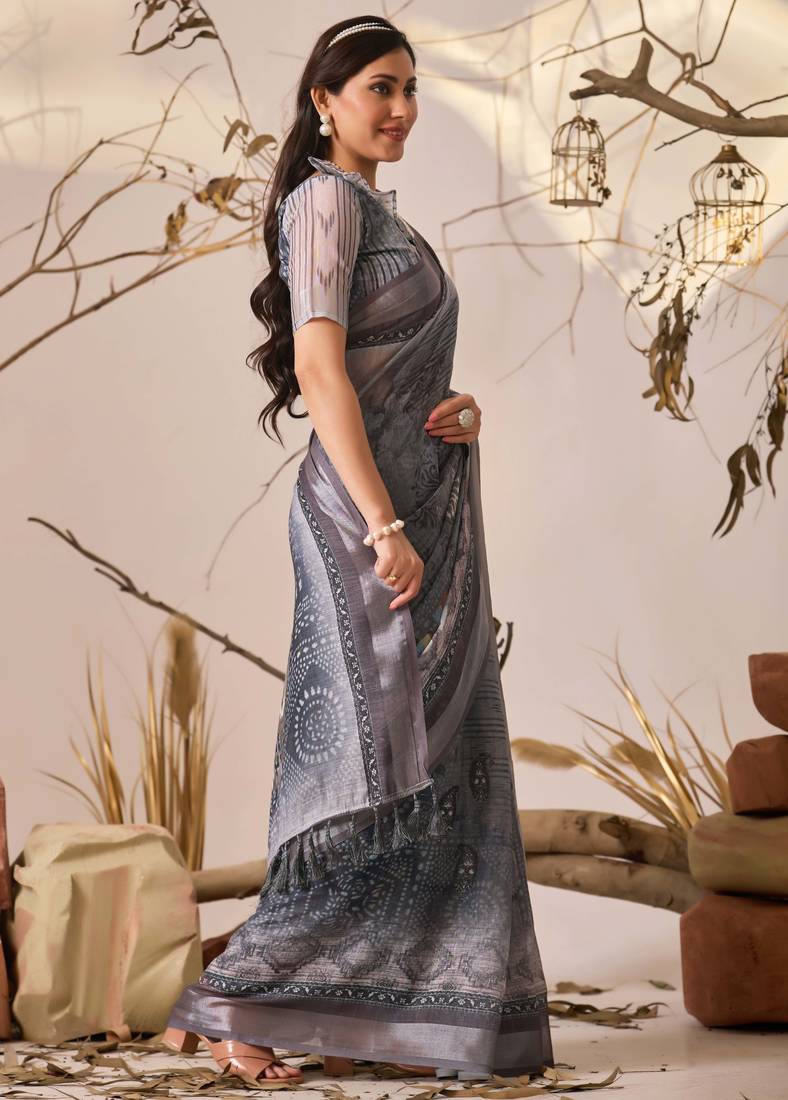 Grey linen cotton digital floral printed saree with patola border | contemporary printed linen saree with blouse