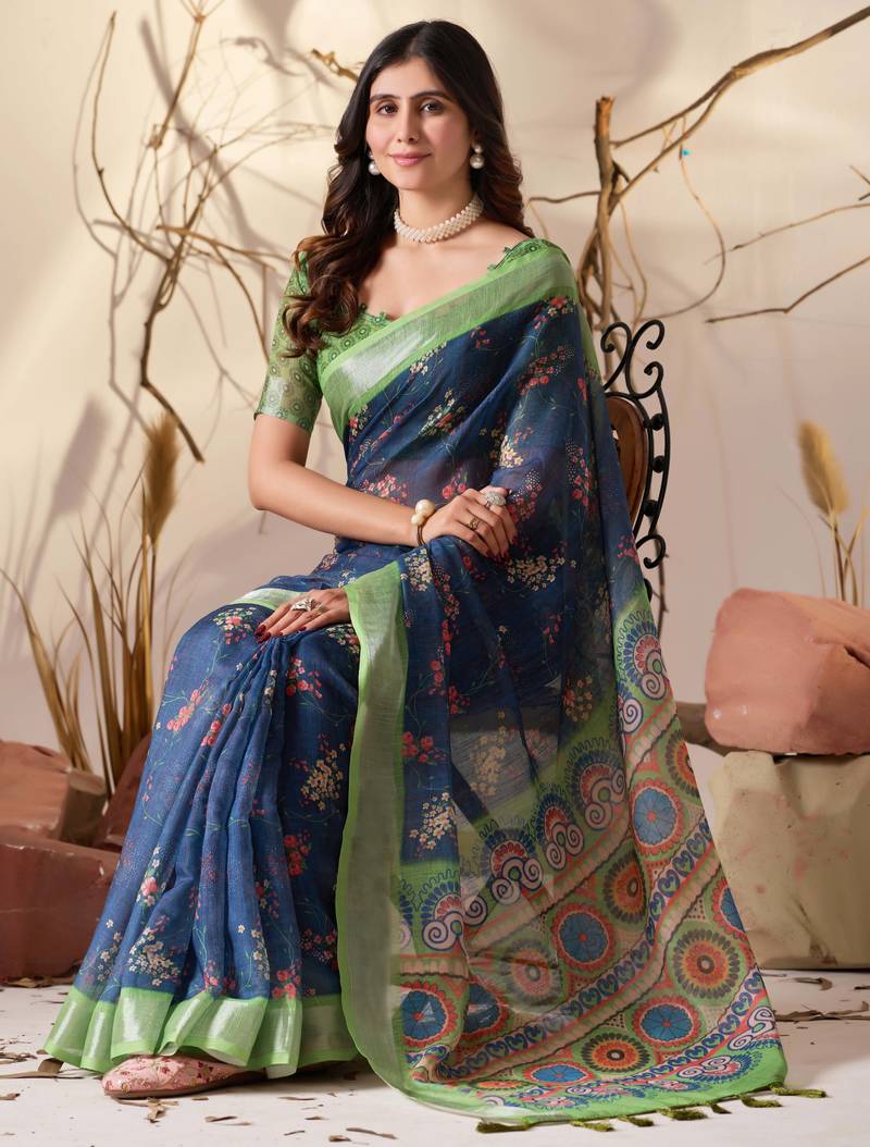 | Product Description | • Premium Linen Cotton Saree Featuring Elegant Floral Digital Print For A Modern, Stylish Look