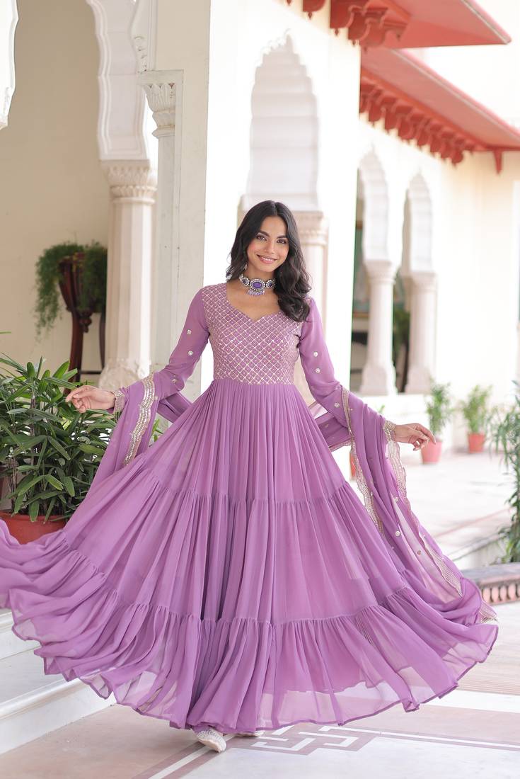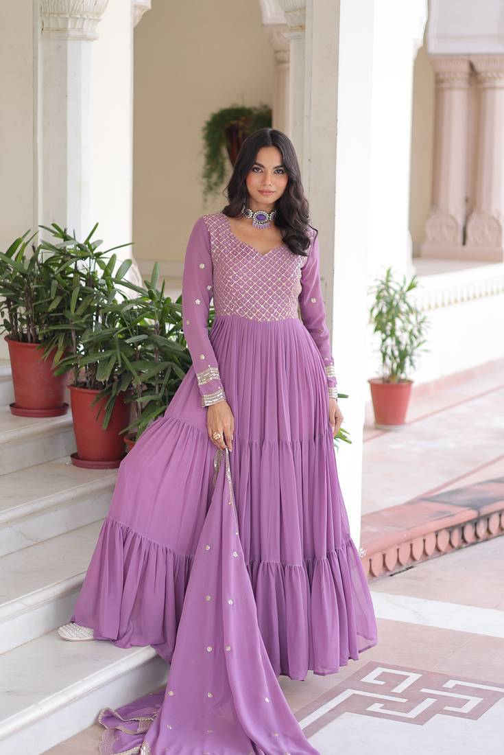 Product Name Purple Faux Georgette Sequins Zari Embroidered Kurti With Dupatta