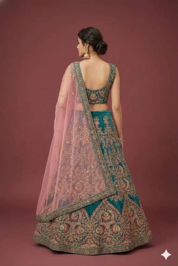 | Product Name | Alluring Teal Blue Thread Zari Dori And Sequins Embroidered Velvet Bridal Wear Lehenga Choli For Women | |