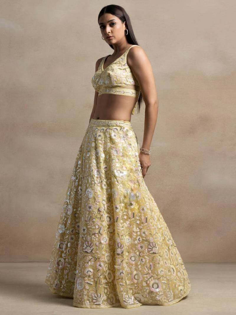 Yellow sequins embroidered soft net fabric indian designer bollywood lehenga