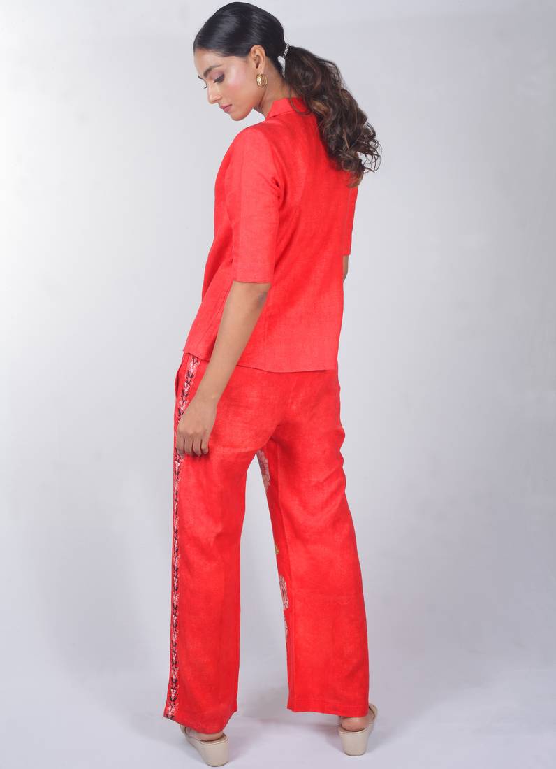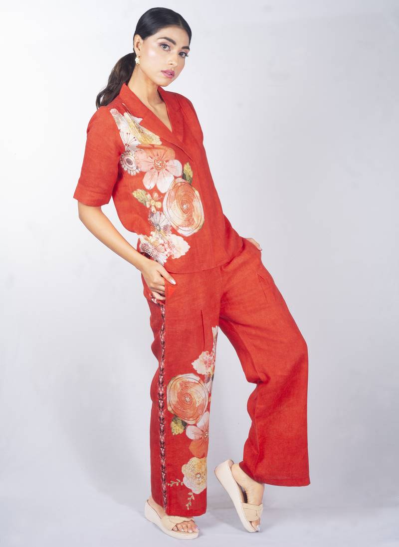 This Red Printed Linen Co Ord Set Exudes Fresh Elegance And Effortless Style. Crafted From Breathable Linen Fabric, It Features Vibrant Prints That Add A Lively, Modern Touch. Perfect For Day Outings And Casual Gatherings, It Offers A Comfortable Fit, Airy Feel, And Timeless Contemporary Charm.