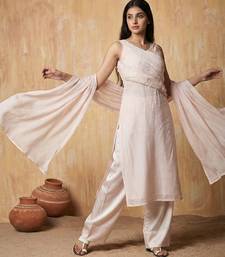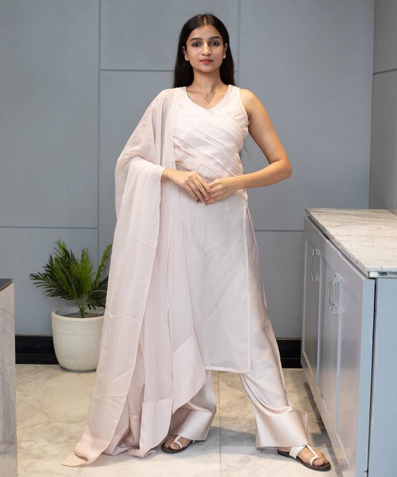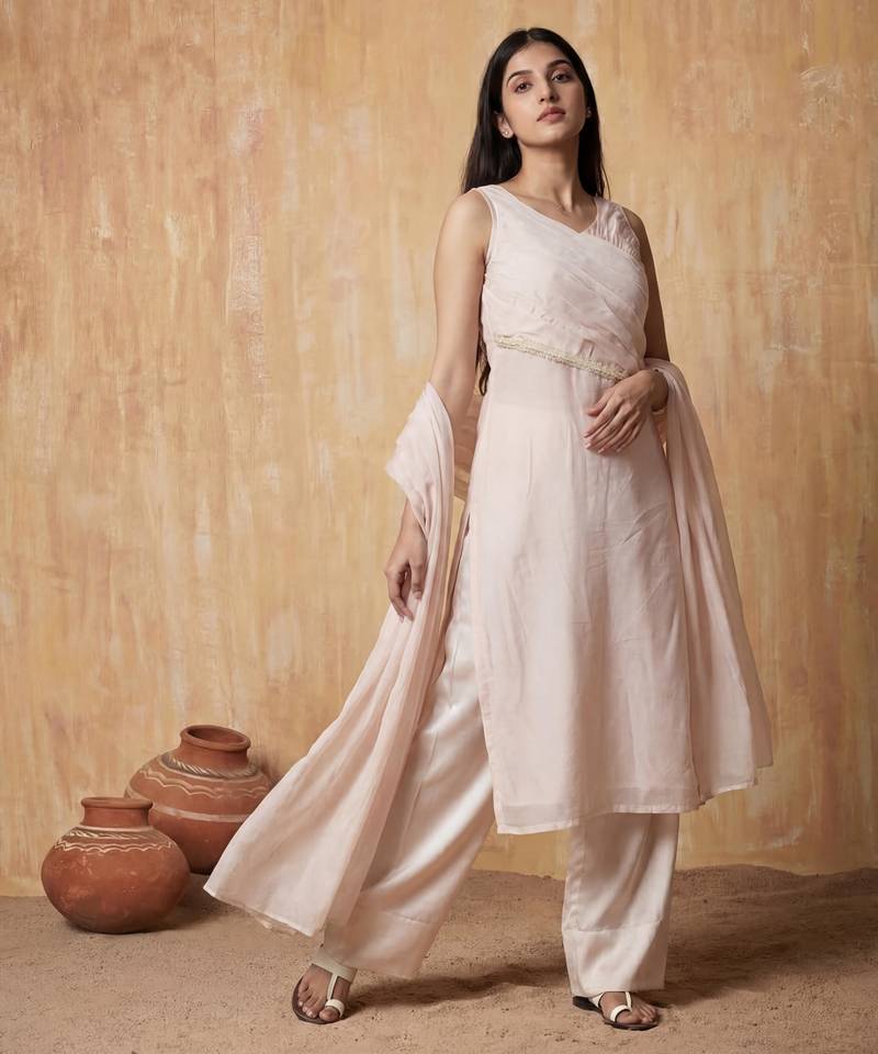 | Product Description | Pastel Pink Sleeveless Kurta With Dupatta And Farsi Pants Made From Modal (Vegan) Silk And Organza. |