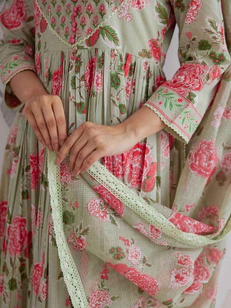 Anarkali cotton printed hand work embroidered kurta with pant and dupatta for women