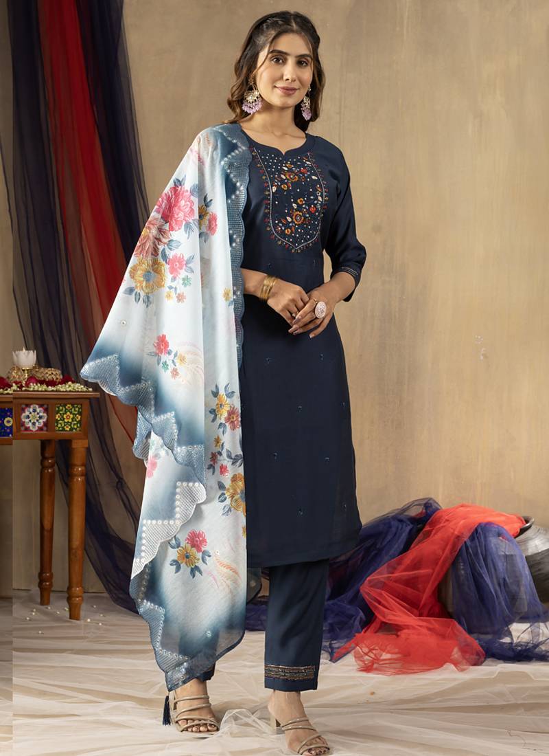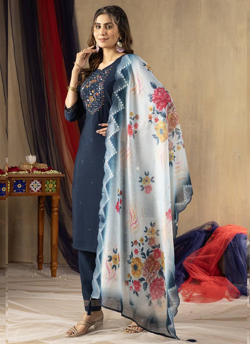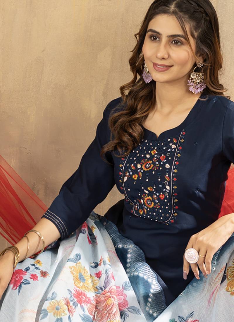 | Product Name | Blue Viscose Mango Silk Embroidered Thread Work Salwar Suit | |