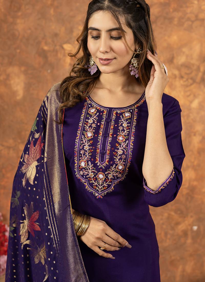 Purple marina silk thread embroidered salwar suit stitched