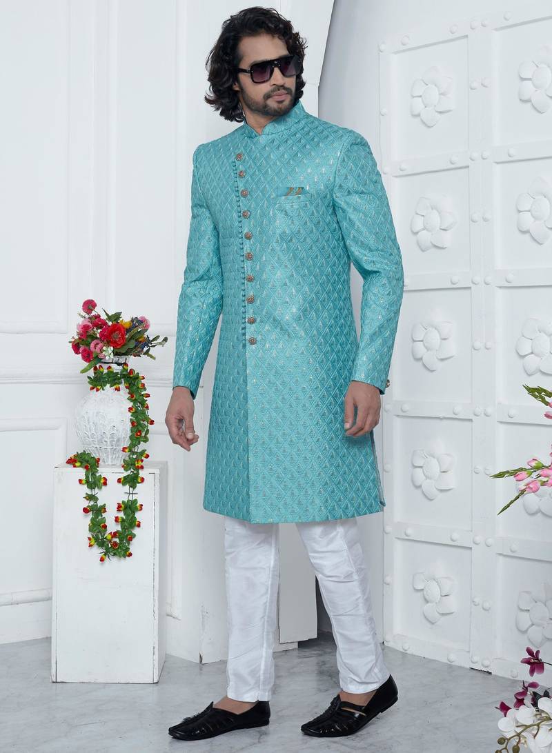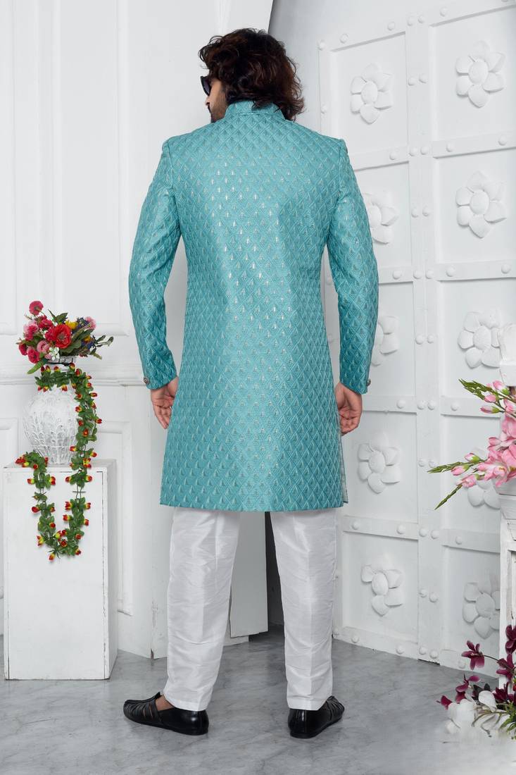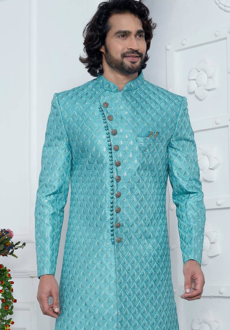 | Product Name | Blue Computer Thread Work On Art Silk Sherwani For Men | |