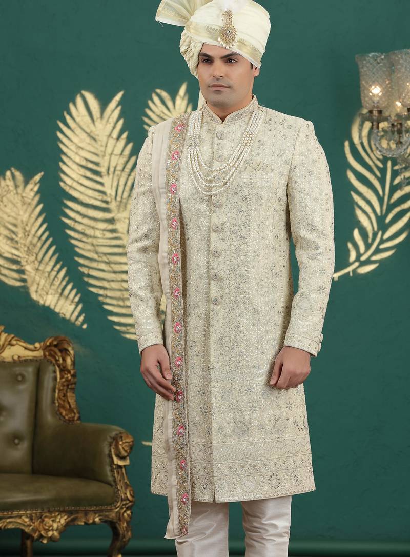 | Product Name | Cream Computer Thread Work On Art Silk Sherwani For Men | |