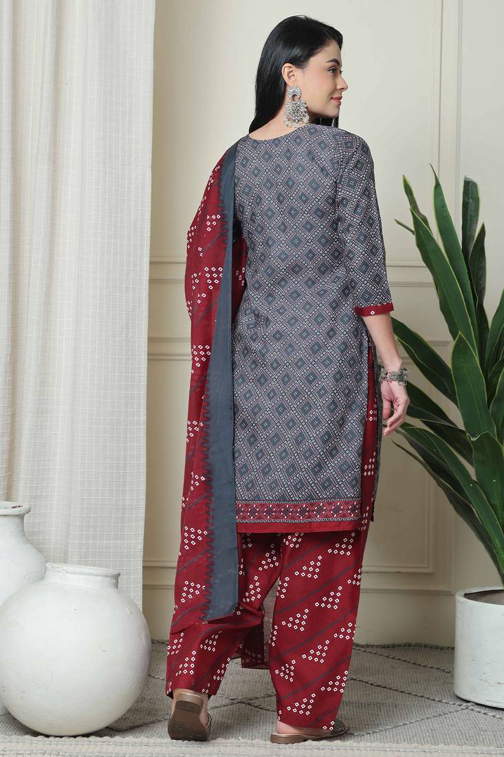 | Product Description | Beautiful Suit Look Pretty Like Never Before.Wearing This Grey Color Suit Which Made From Rajnandini With Maroon Colored Printed Cotton Blend Bottom And Grey & Maroon Colored Cotton Blend Dupatta.Suit Has Also Decorative Work Like Top Bandhej Print, Bottom Bandhej Print & Dupatta Bandhej Print.This Beautiful Suit Features A Classy Printed Work All Over,Which Makes It A Smart Pick For All Occasions. You Can Wear This Suit In Different Styles. You Can Wear It Occasionally Or Casually. |