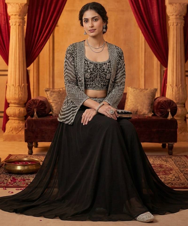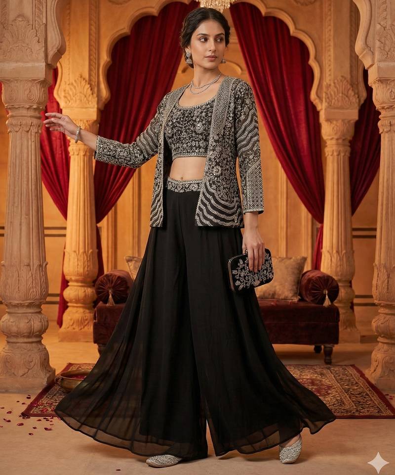 | Product Description | This Stunning Three Piece Outfit Features A Crop Top, Bottom, And Jacket, All Crafted From Luxurious Georgette Silk For A Flowy, Elegant Look. The Crop Top Is Designed With A Spaghetti Strap Style, Offering A Modern Appeal While Ensuring A Comfortable, Secure Fit. It Is Adorned With Intricate Silver Sequin And Threadwork, Harmoniously Complementing The Entire Ensemble. The Bottoms Are Made From Georgette Silk, Offering A Flattering, High Waisted Design That Adds Volume And Dramatic Flair, Ensuring Both Style And Ease Of Movement. The Jacket Is Made From Lightweight Georgette Silk, Providing A Breathable Yet Luxurious Feel. It Features Beautiful Silver Sequin And Threadwork, Creating A Dazzling Effect. With Its Open Front Design And Long Sleeves, The Jacket Enhances The Outfit With Sophistication And Grace. This Ready To Wear Ensemble Is Perfect For Weddings, Gatherings, Festivals, And Other Special Events, Combining Contemporary Style With Timeless Elegance. |