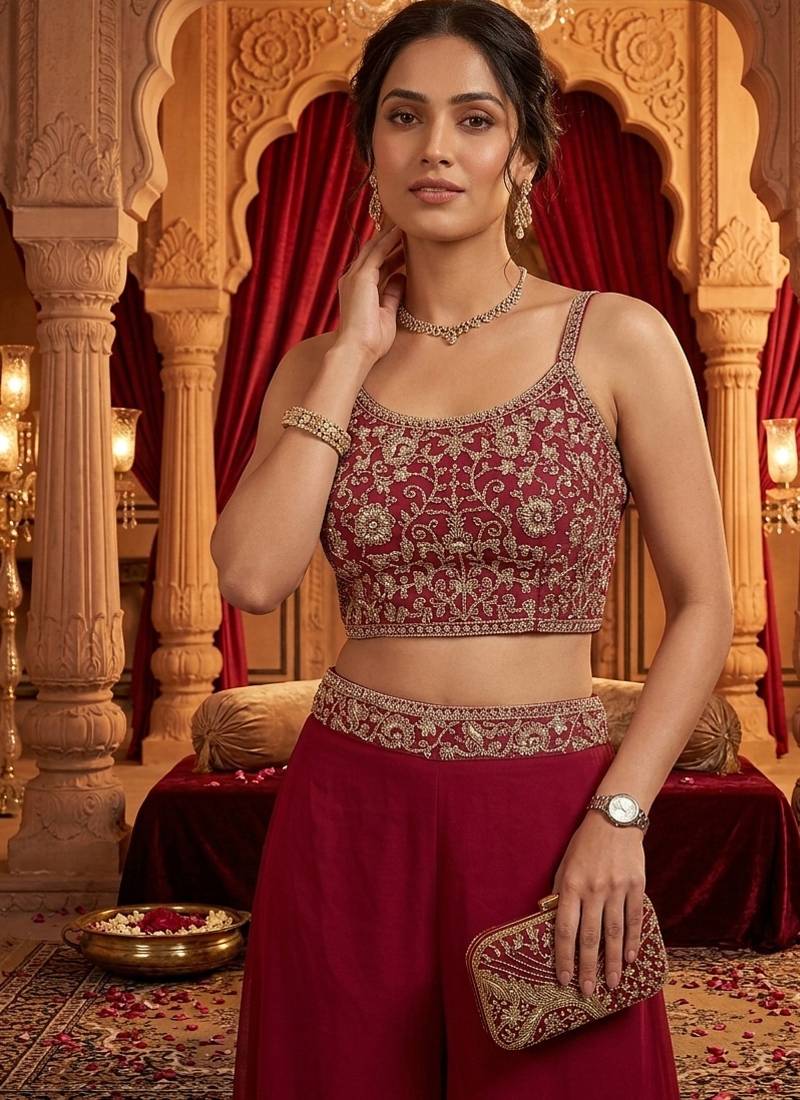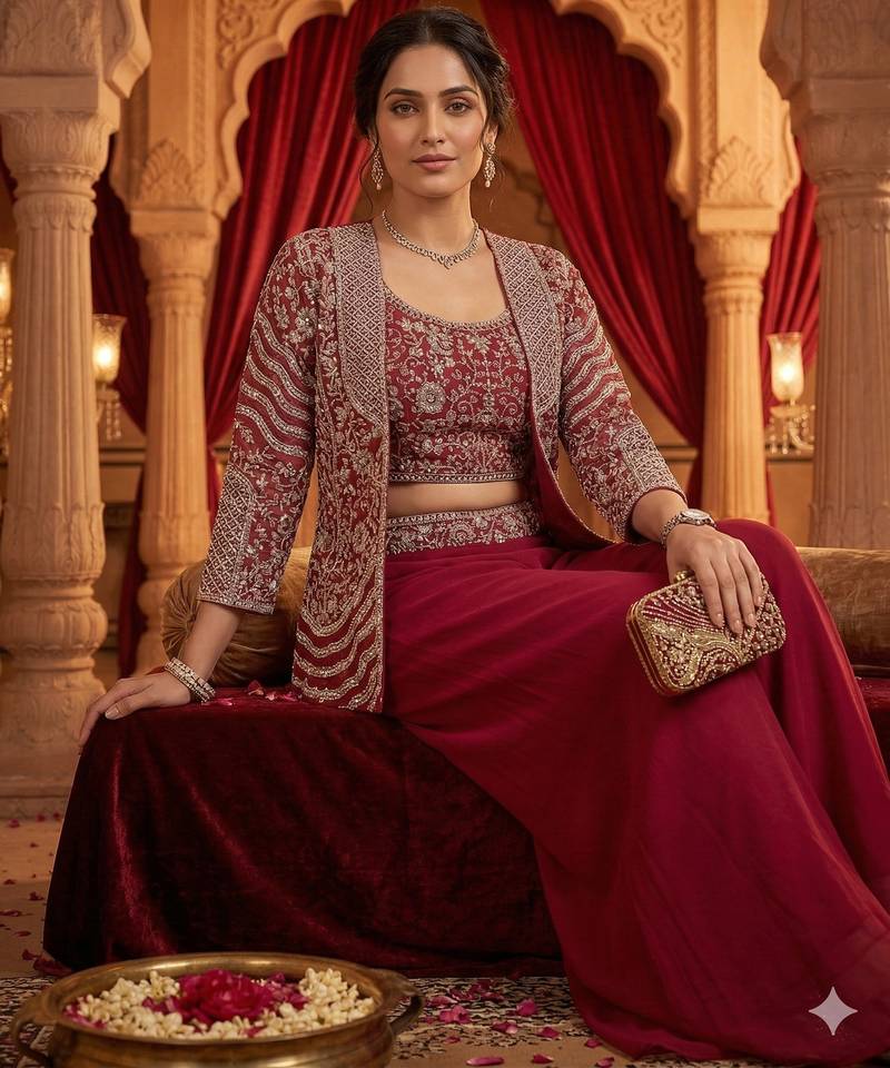 | Product Description | This Stunning Three Piece Outfit Features A Crop Top, Bottom, And Jacket, All Crafted From Luxurious Georgette Silk For A Flowy, Elegant Look. The Crop Top Is Designed With A Spaghetti Strap Style, Offering A Modern Appeal While Ensuring A Comfortable, Secure Fit. It Is Adorned With Intricate Silver Sequin And Threadwork, Harmoniously Complementing The Entire Ensemble. The Bottoms Are Made From Georgette Silk, Offering A Flattering, High Waisted Design That Adds Volume And Dramatic Flair, Ensuring Both Style And Ease Of Movement. The Jacket Is Made From Lightweight Georgette Silk, Providing A Breathable Yet Luxurious Feel. It Features Beautiful Silver Sequin And Threadwork, Creating A Dazzling Effect. With Its Open Front Design And Long Sleeves, The Jacket Enhances The Outfit With Sophistication And Grace. This Ready To Wear Ensemble Is Perfect For Weddings, Gatherings, Festivals, And Other Special Events, Combining Contemporary Style With Timeless Elegance. |