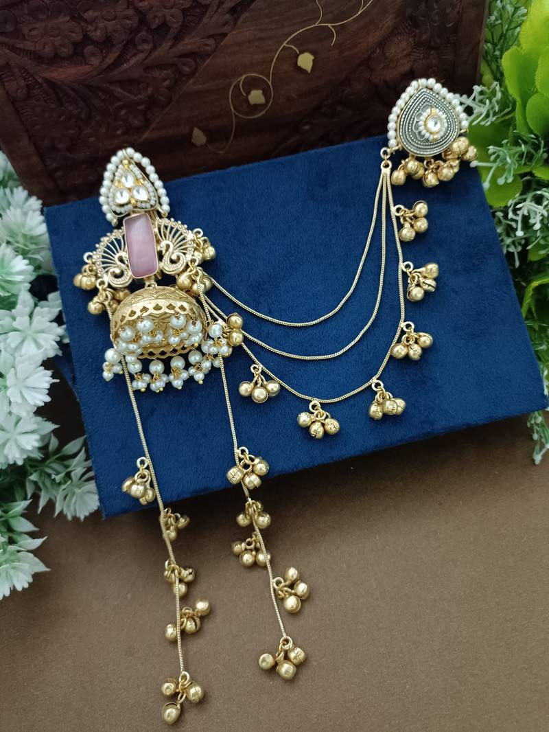 Gold-plated kashmiri long jhumka earrings with matching ear chains