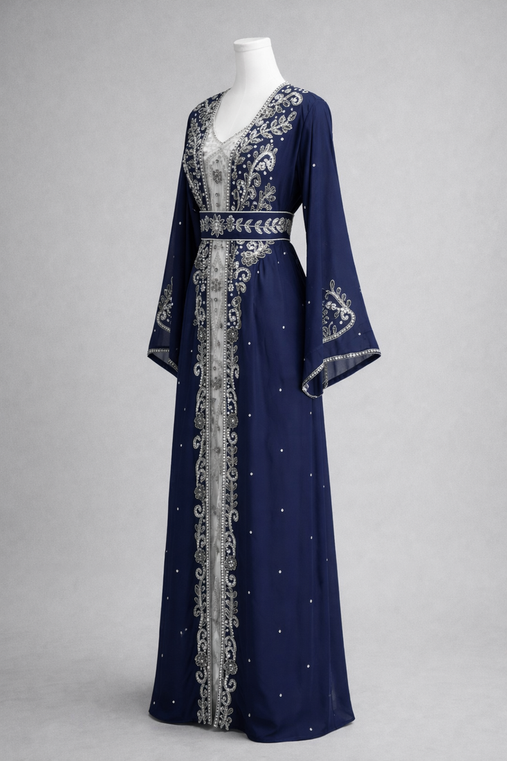 | Product Description | This Breathtaking Kaftan Gown Captures The Essence Of Luxury Event Wear, Ideal For Weddings, Receptions, And Gala Evenings. Made From Soft, Flowing Georgette, It Falls Beautifully To A Full Length Silhouette And Features A Flattering V Neckline That Adds A Touch Of Modern Grace. Every Inch Of The Gown Is Richly Detailed With Intricate Gold And Silver Toned Hand Embroidery, Highlighted By Delicate Sparkling Embellishments Arranged In A Traditional Pattern. The Flowing Split Batwing Style Cape Sleeves Drape Elegantly To The Floor, Creating A Sense Of Movement And Regal Charm. Designed To Turn Heads, This Piece Is Perfect For Making A Lasting Impression At Any Grand Occasion. |