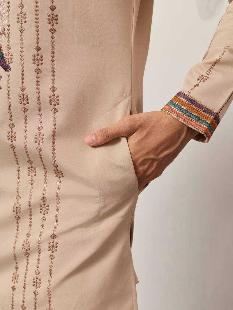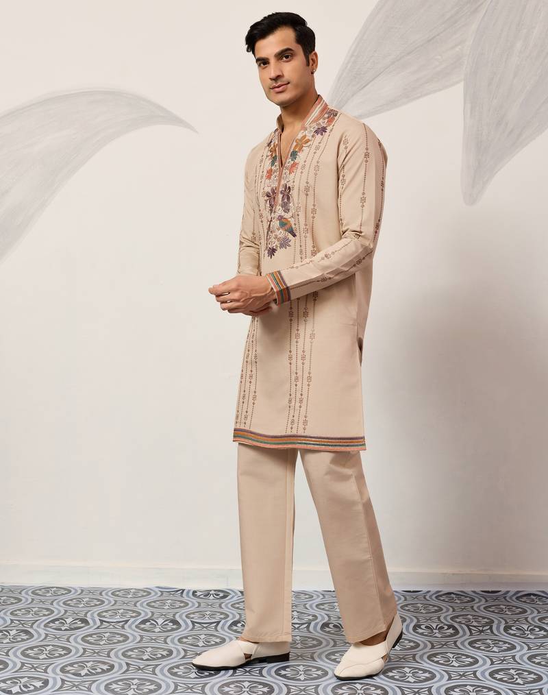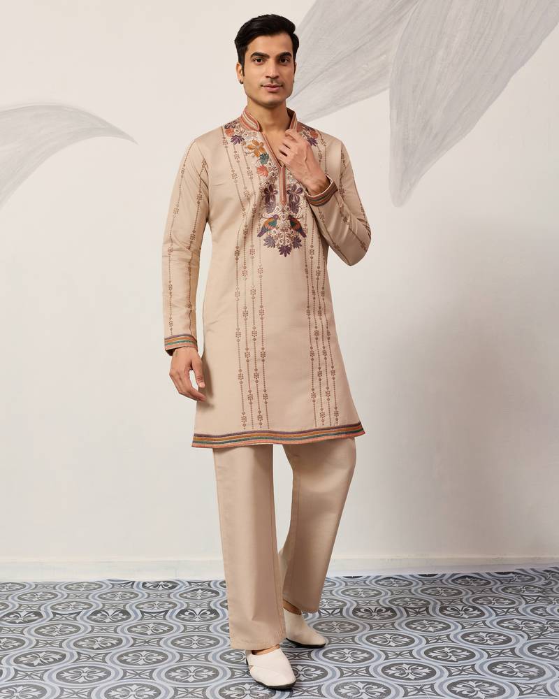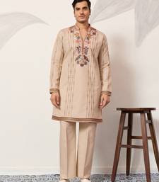 Beige viscose silk thread & sequins embroidered work wedding festival marriage party wear straight mens kurta with pant