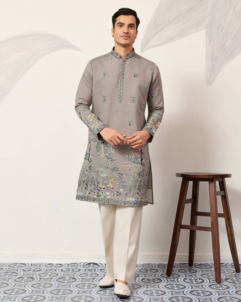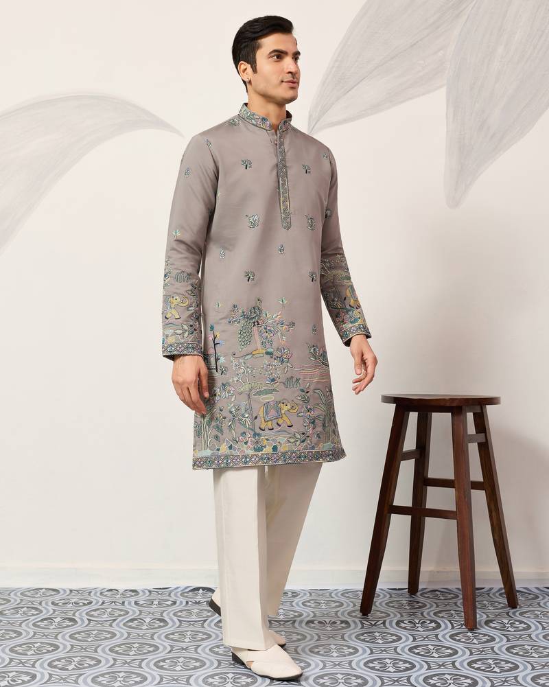 Grey viscose silk thread & sequins embroidered work wedding festival marriage party wear straight mens kurta