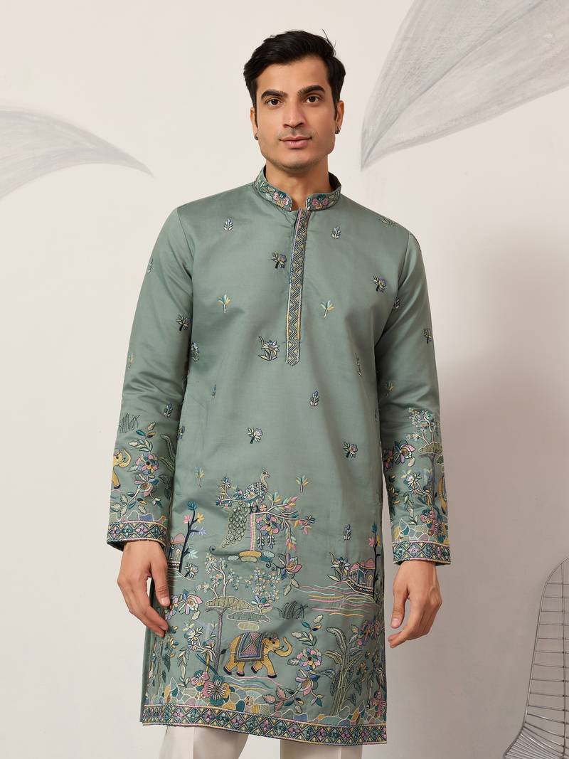 Pista green viscose silk thread & sequins embroidered work wedding festival marriage party wear straight mens kurta
