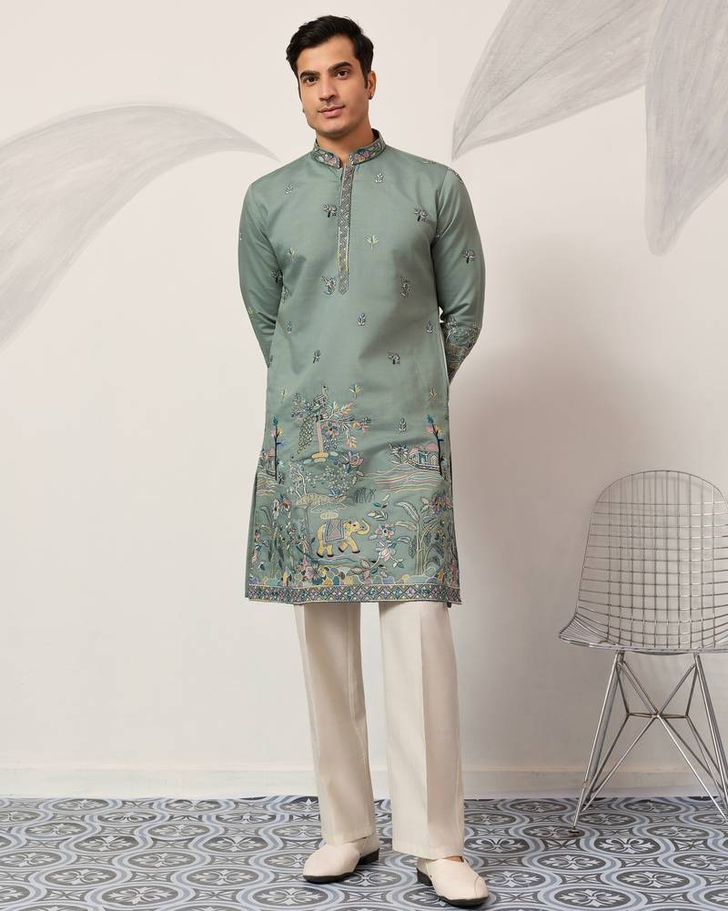 | Product Name | Pista Green Viscose Silk Thread & Sequins Embroidered Work Wedding Festival Marriage Party Wear Straight Mens Kurta | |