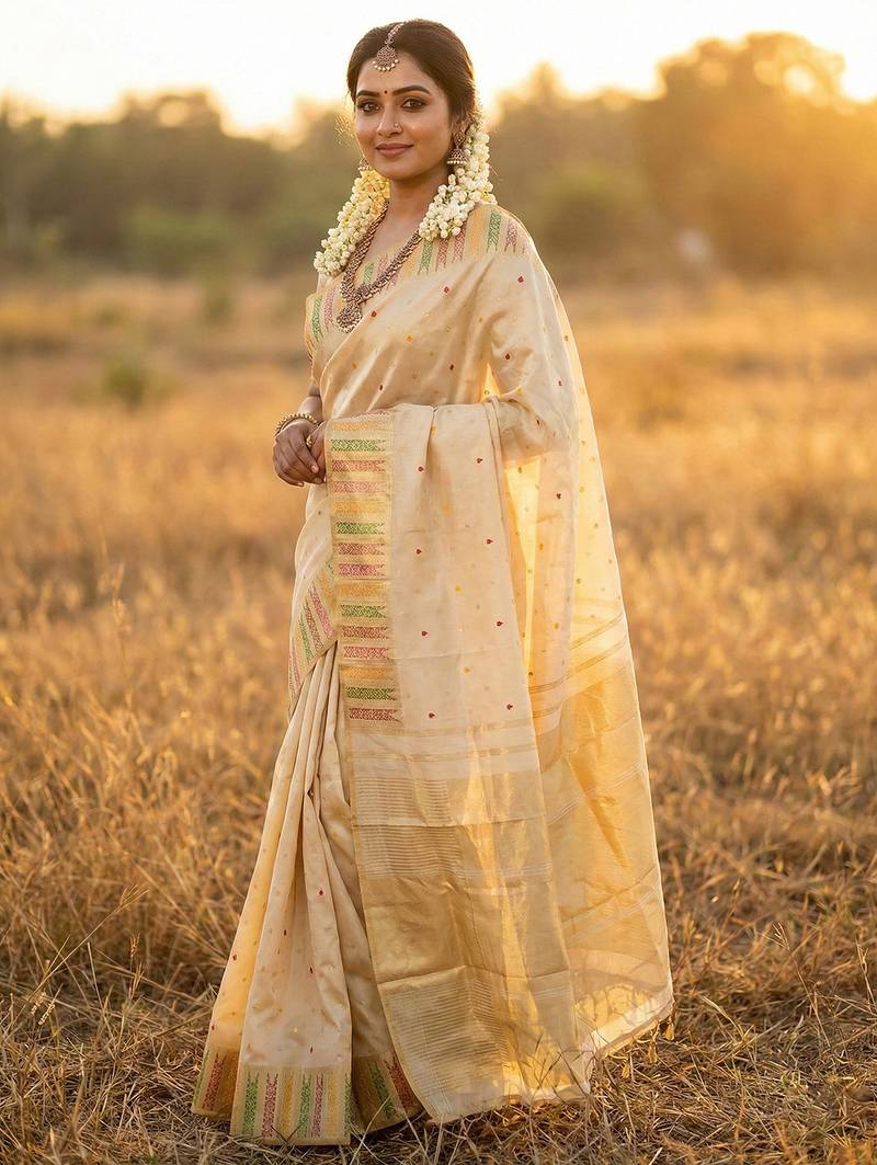 | Product Name | Sutriti Off White Cream Kerala Style Soft Silk Saree With Gold Zari Border | |