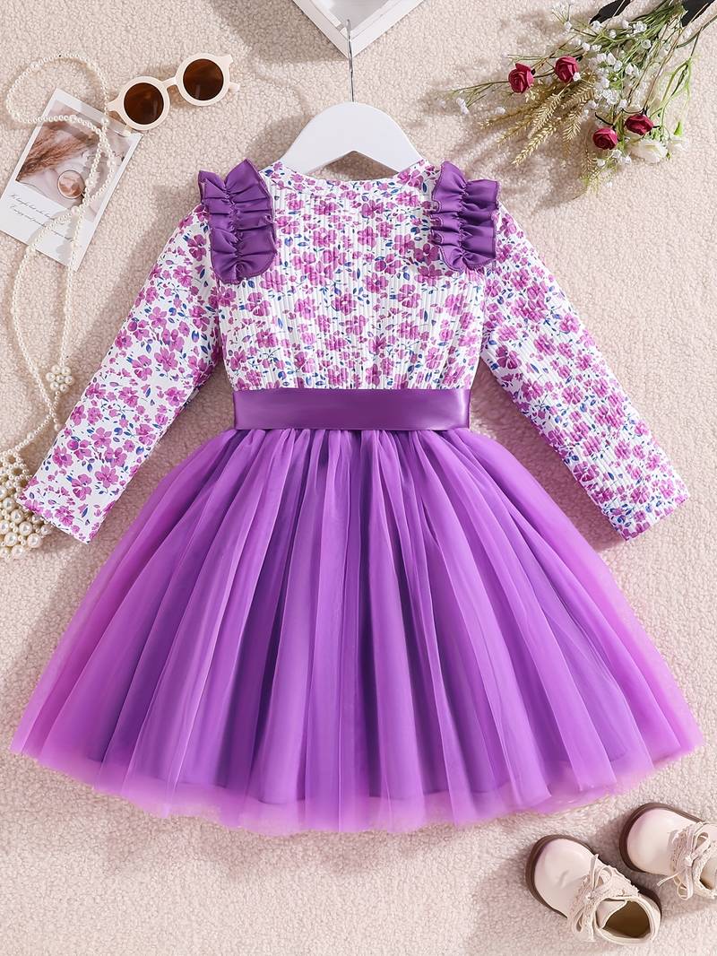 Elegant Fit & Flare Dress With A Beautiful Floral Printed Bodice And Voluminous Net Skirt Soft And Breathable Fabric Ensures All Day Comfort For Kids Stylish Long Sleeves With Ruffle Shoulder Detailing Add A Trendy Touch Attractive Satin Bow At The Waist Enhances The Overall Princess Look Perfect For Parties, Birthdays, Festive Occasions, And Special Events