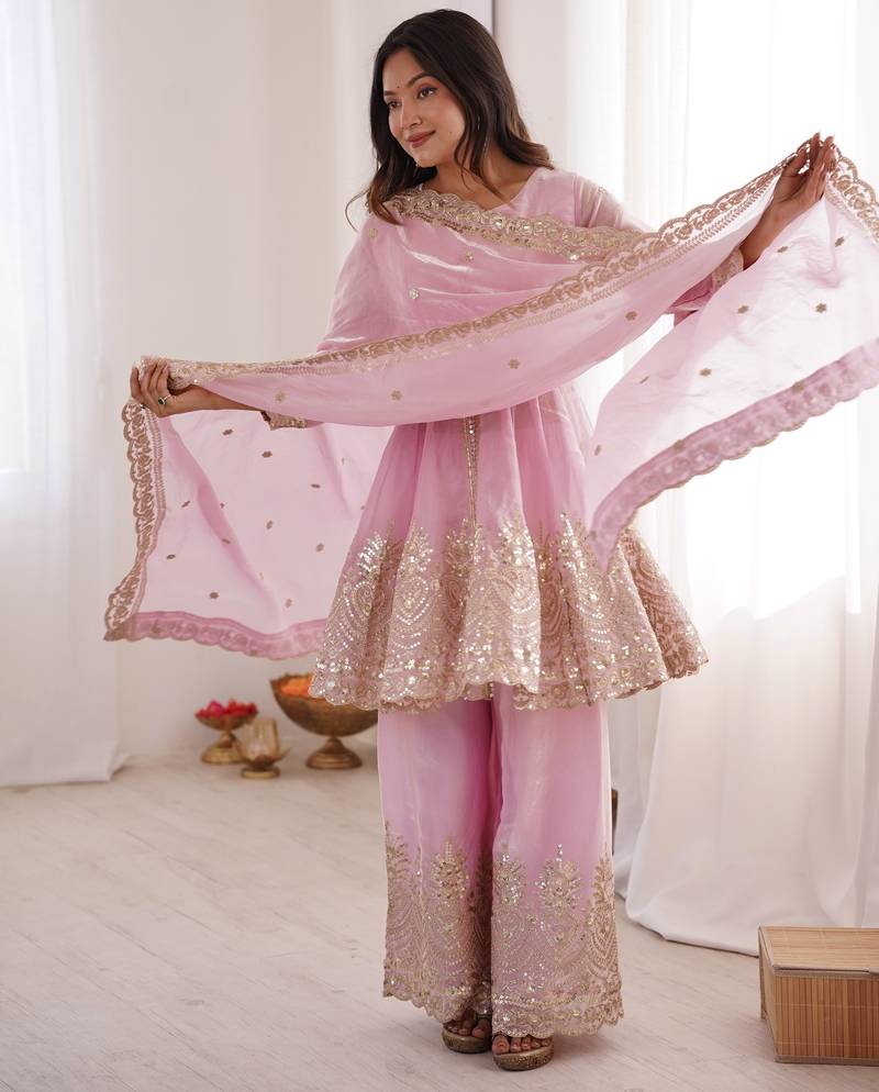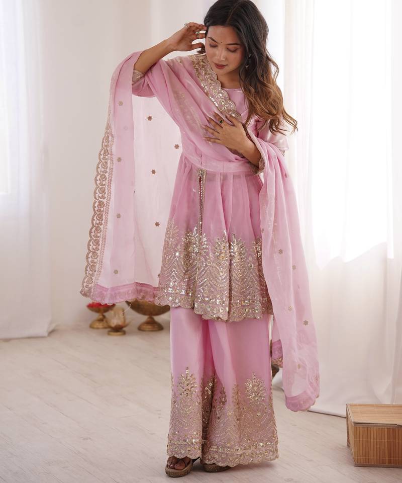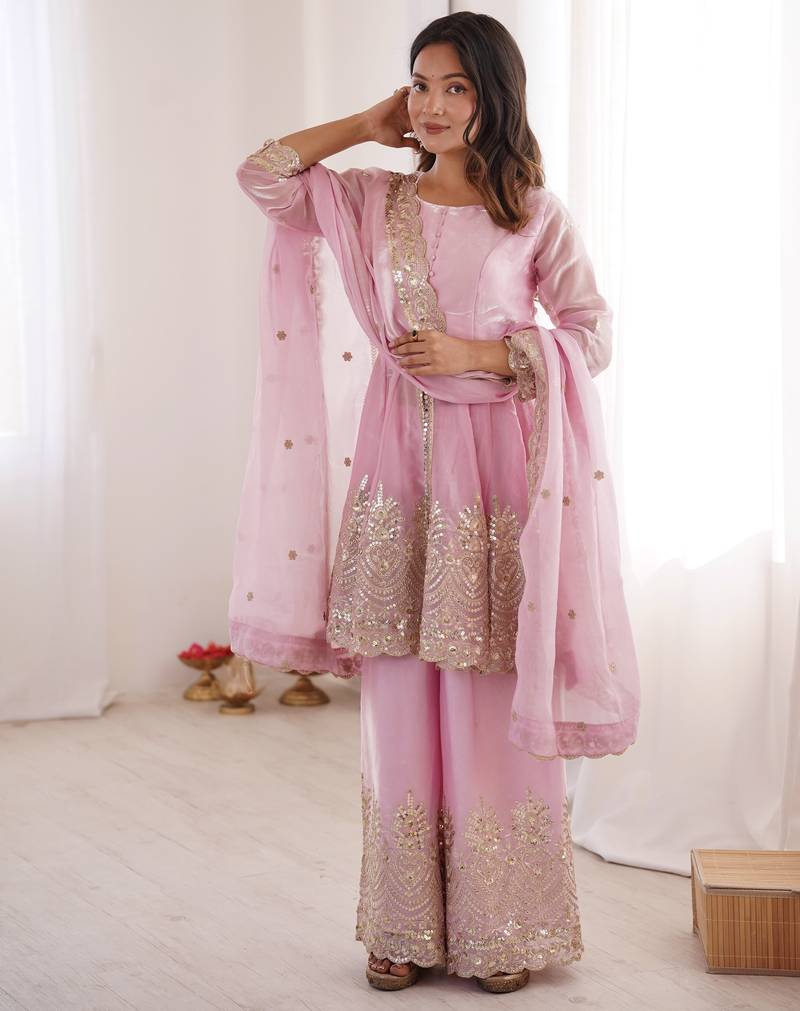 Baby pink color fendy satin silk embroidery work party wear salwar suit stitched