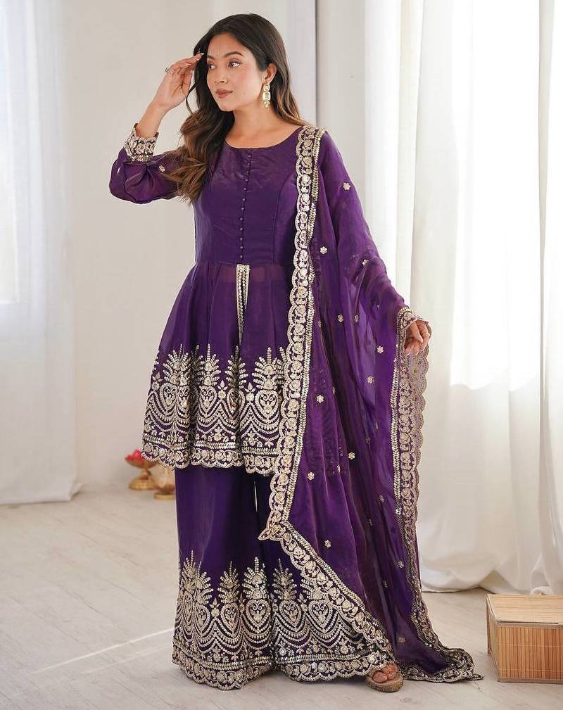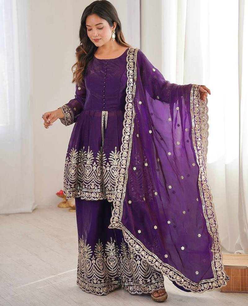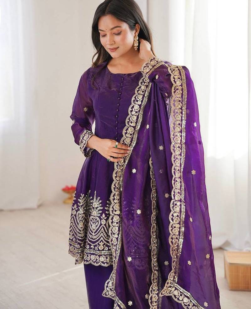 Purple color fendy satin silk embroidery work party wear salwar suit stitched