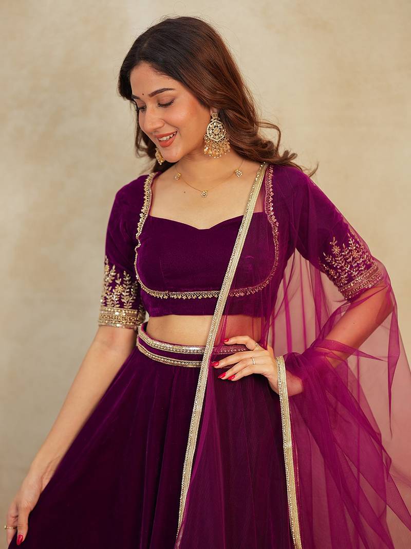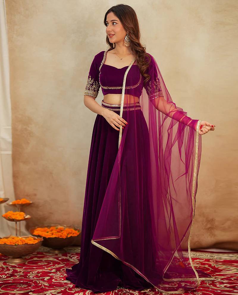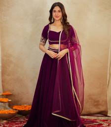 Purple velvet embroidery sequence work lehenga choli blouse with dupatta for women
