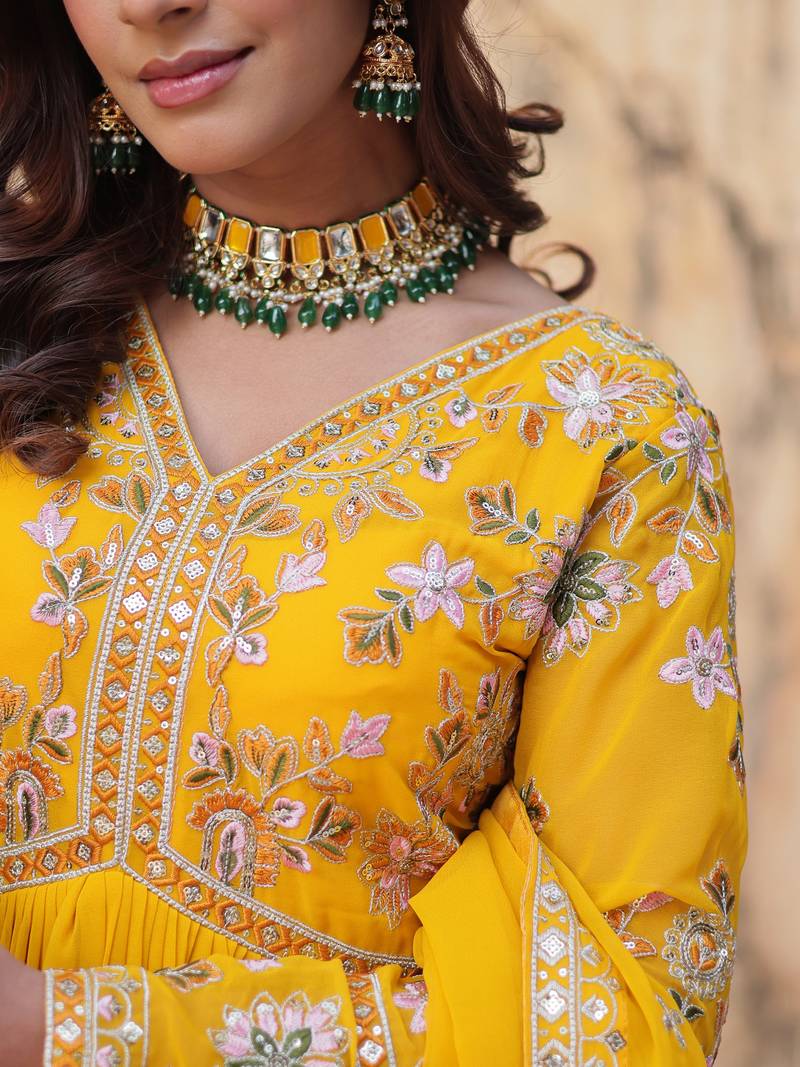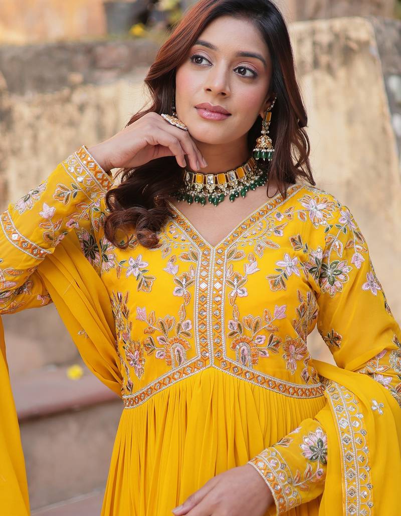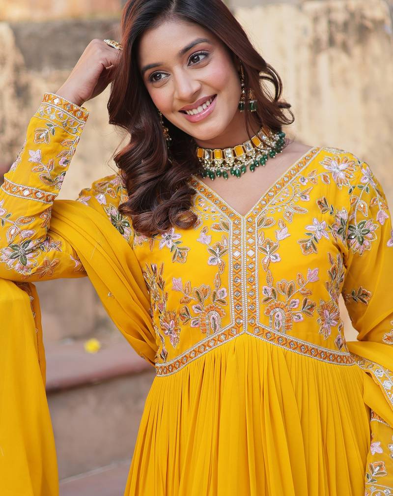 Artistic yellow thread work georgette haldi wear gown with dupatta stitched