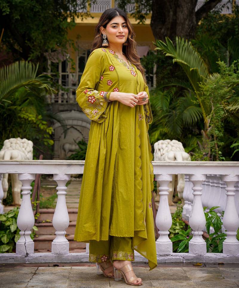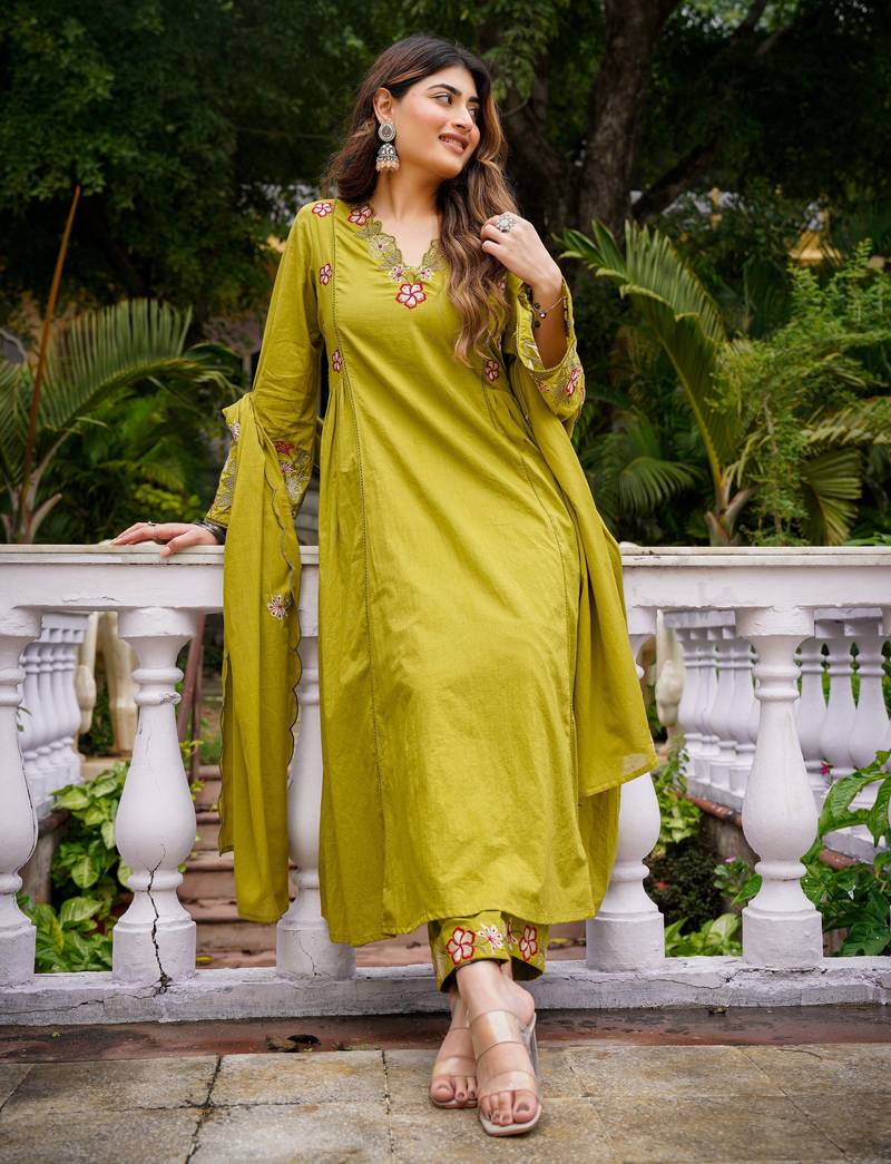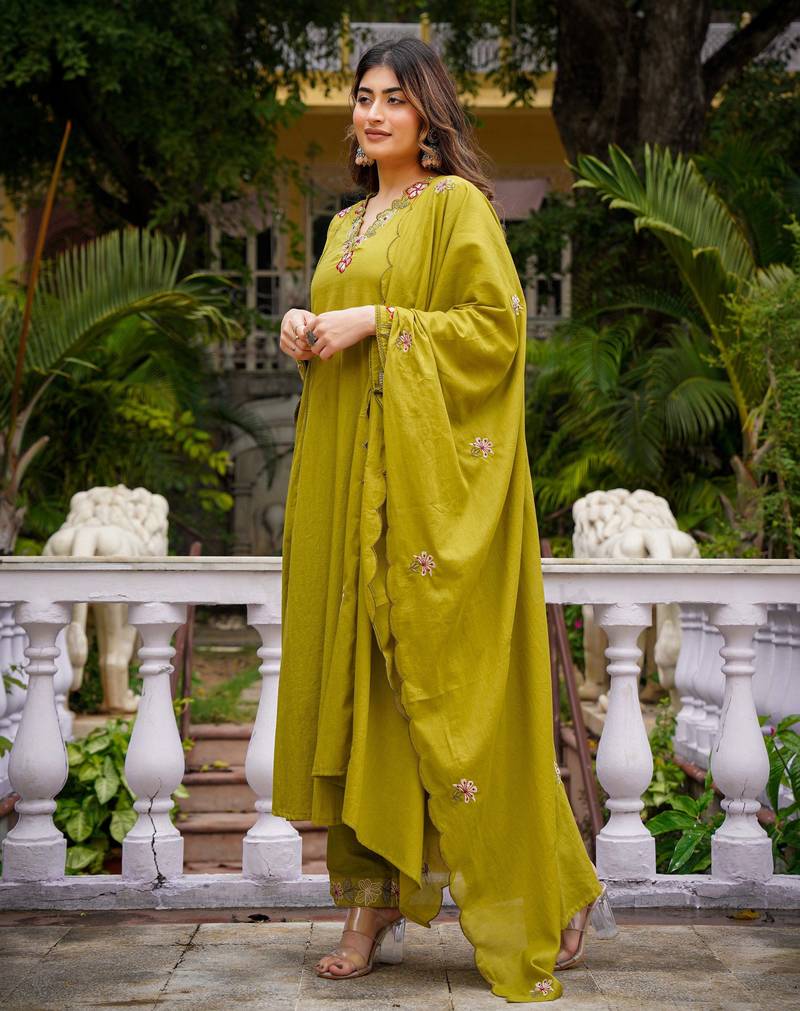Stylish olive green embroidered chanderi silk kurta set with dupatta & pant for women