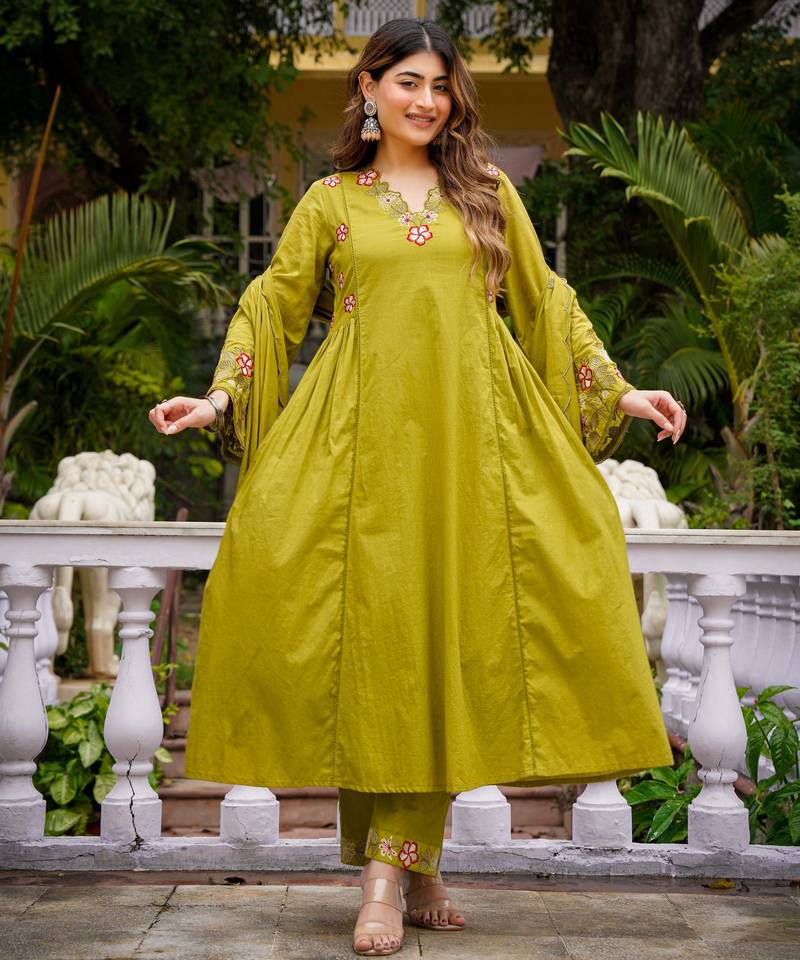 Refresh Your Ethnic Wardrobe With This Elegant Red Kurta Set, Designed To Bring Together Comfort And Graceful Style. The Kurta Features A Beautifully Flared Silhouette That Enhances Movement And Creates A Soft, Feminine Look. Delicate Floral Embroidery On The Neckline And Sleeves Adds A Subtle Yet Charming Touch, Elevating The Simplicity Of The Earthy Olive Tone.Crafted From Lightweight And Breathable Fabric, This Outfit Ensures All Day Comfort While Maintaining A Stylish And Refined Appearance. The Matching Bottoms With Coordinated Embroidery Complete The Ensemble, Making It A Perfect Choice For Casual Festive Wear, Daytime Functions, Family Gatherings, And Small Celebrations.The Minimal Yet Artistic Design Makes This Outfit Versatile For Both Traditional And Contemporary Styling. Pair It With Statement Earrings And Simple Footwear To Achieve An Effortlessly Elegant And Chic Ethnic Look.