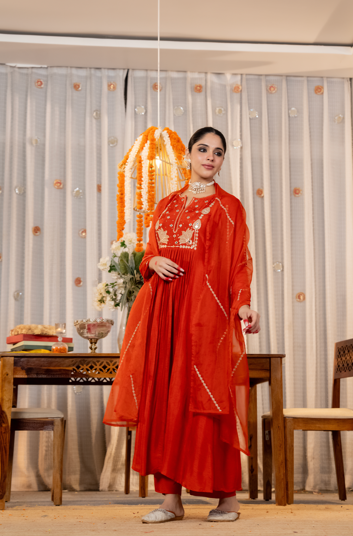 Stylish orange embroidered chanderi silk anarkali kurta set with dupatta & pant for women