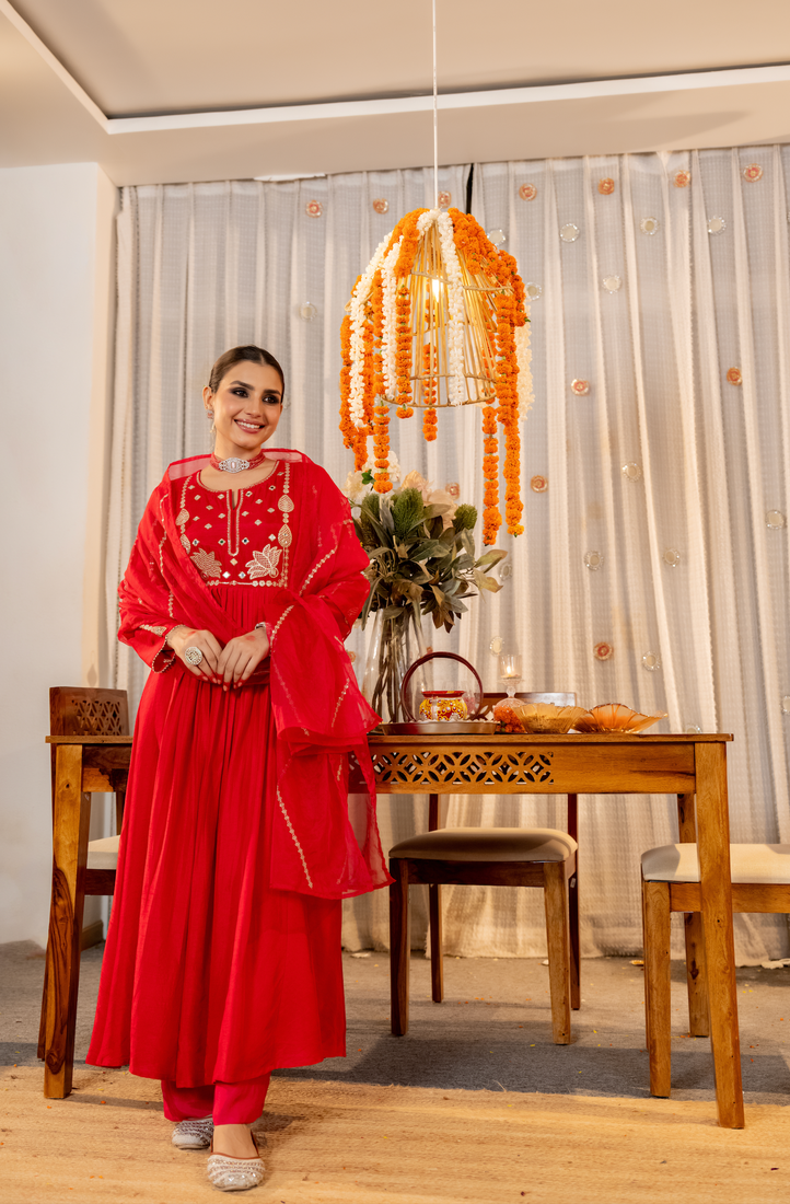 Stylish red embroidered chanderi silk anarkali kurta set with dupatta & pant for women