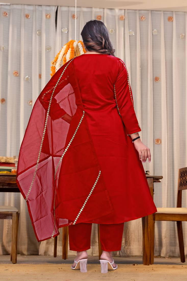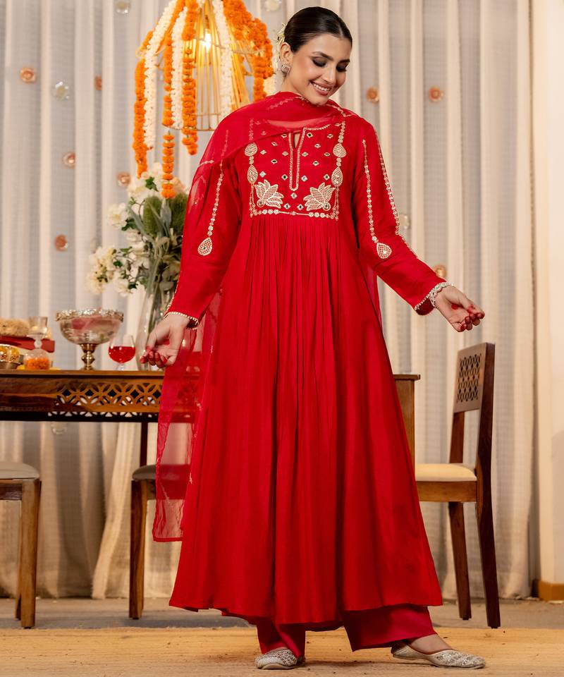 | Product Name | Stylish Red Embroidered Chanderi Silk Anarkali Kurta Set With Dupatta & Pant For Women | |