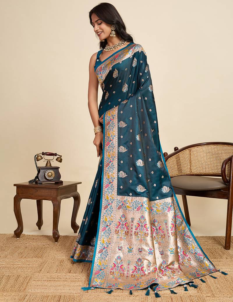 | Product Description | Soft Silk Sarees Premium Two Tone Satin Fabric With Unique Paithnai Designs And Dark Colour Full Border Zari Motifs With Mina Kari All Over The Body Having Rich Woven Zari Pallu And Contrast Mina Woven Unique Concept Border Paired With Silk Designer Blouse Same As Shown In Images. |