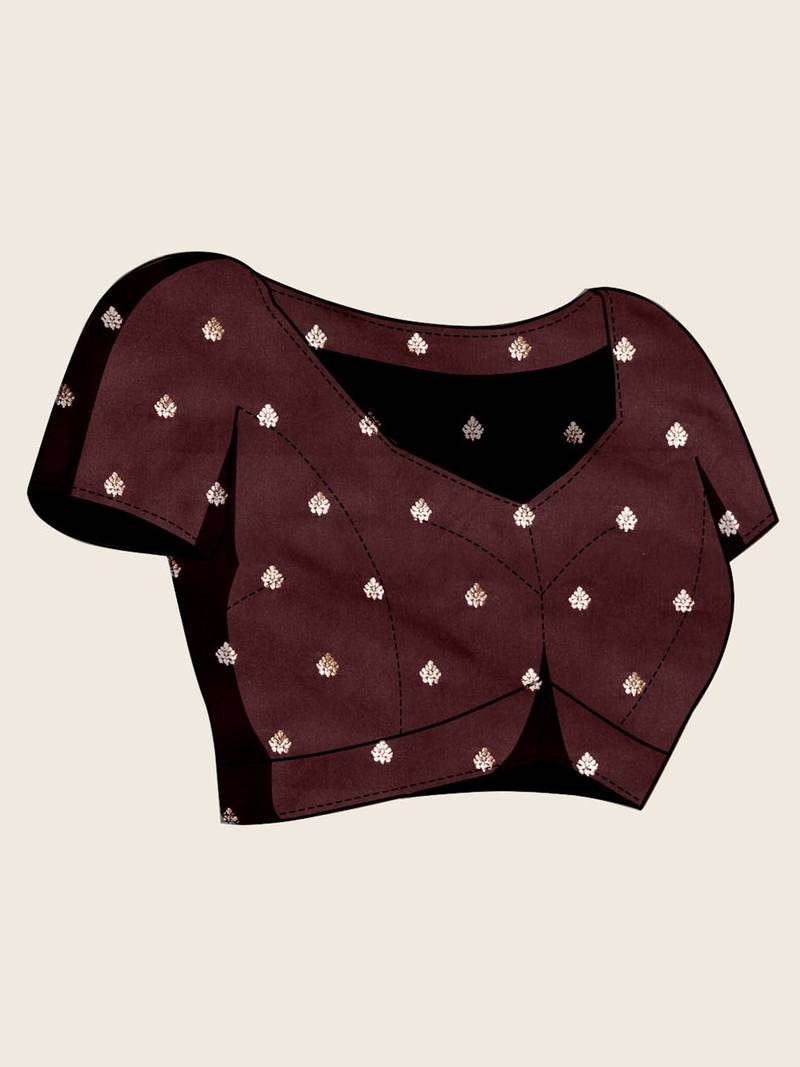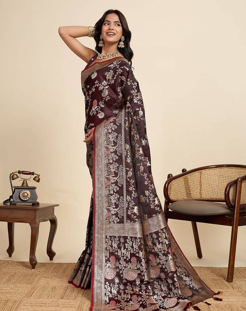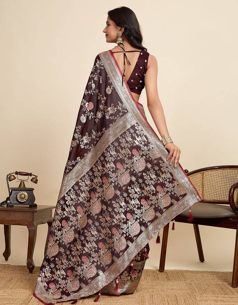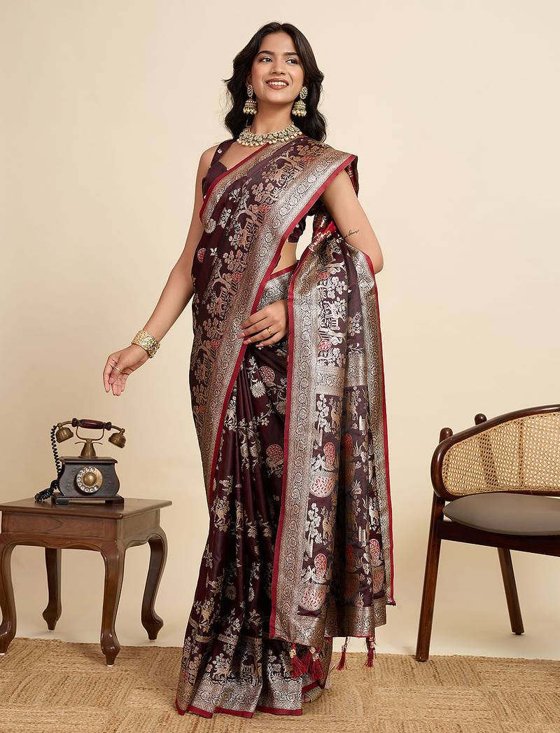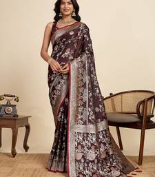 Maroon floral print woven satin banarasi saree with blouse