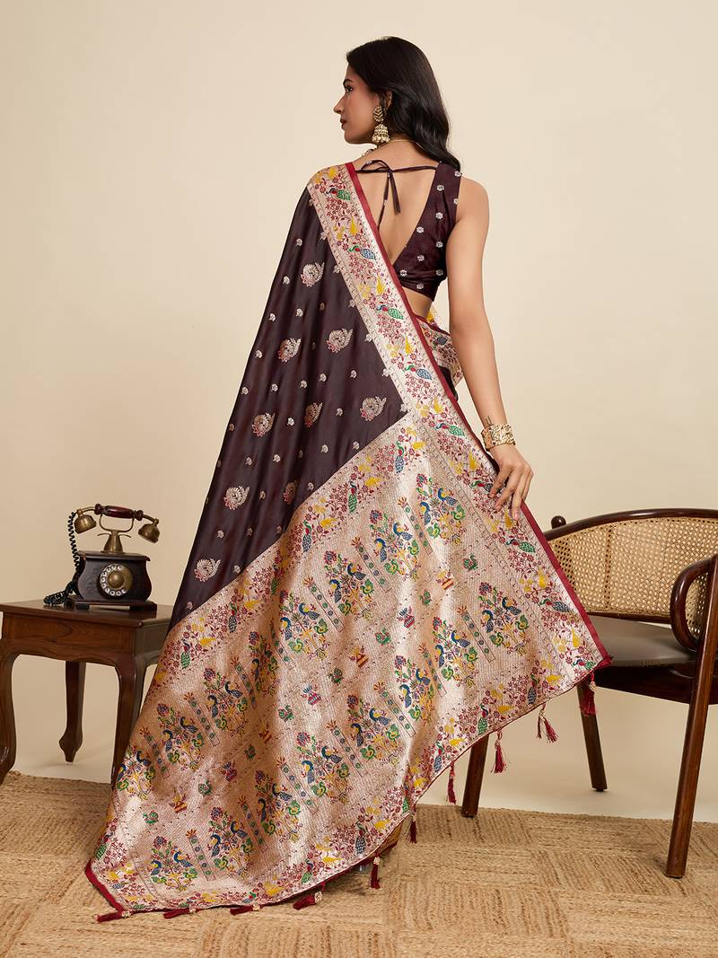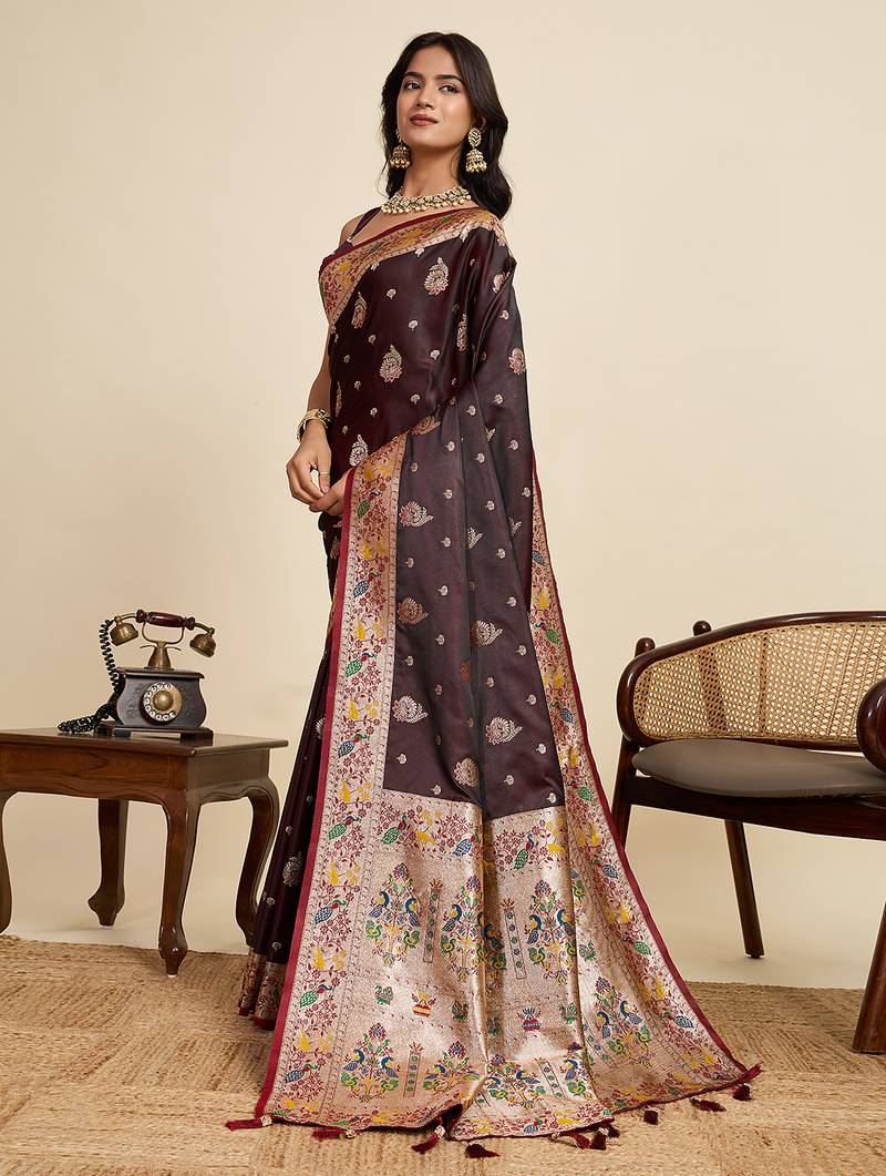 | Product Description | Soft Silk Sarees Premium Two Tone Satin Fabric With Unique Paithnai Designs And Dark Colour Full Border Zari Motifs With Mina Kari All Over The Body Having Rich Woven Zari Pallu And Contrast Mina Woven Unique Concept Border Paired With Silk Designer Blouse Same As Shown In Images. |