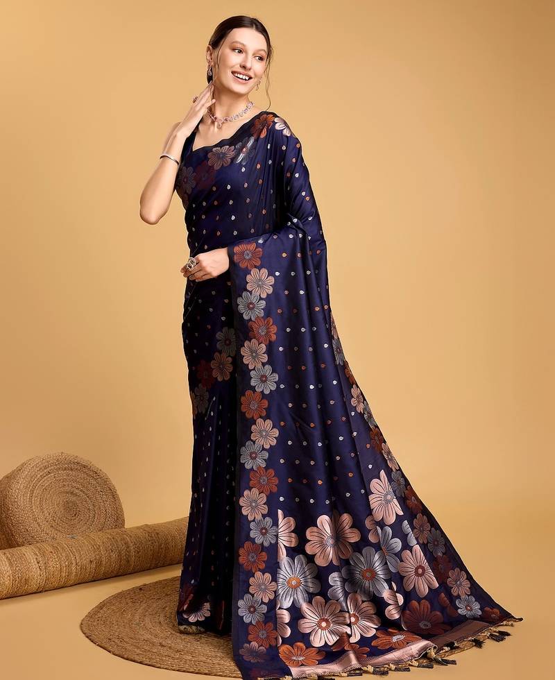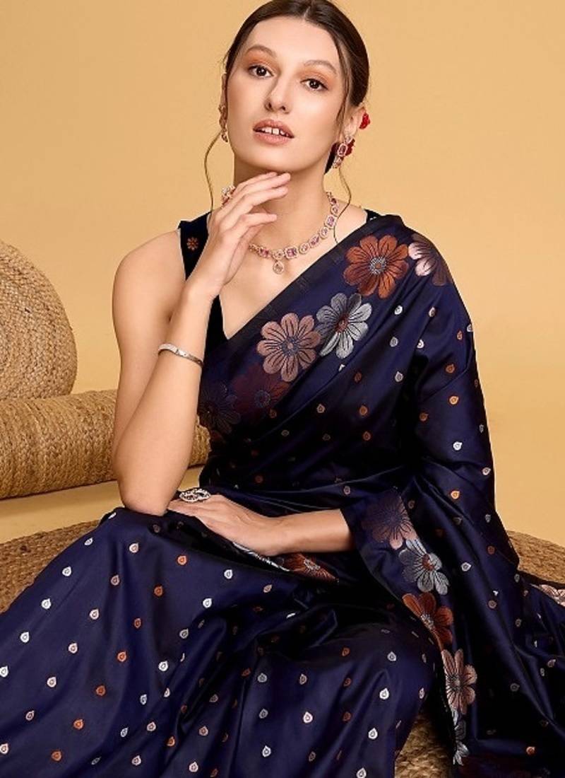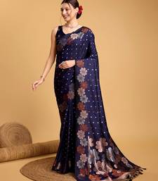 Navy blue woven embellished pure silk banarasi saree with blouse