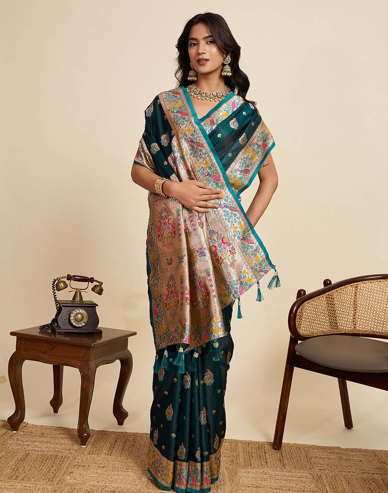 | Product Name | Teal Blue Floral Print Woven Satin Banarasi Saree With Blouse | |