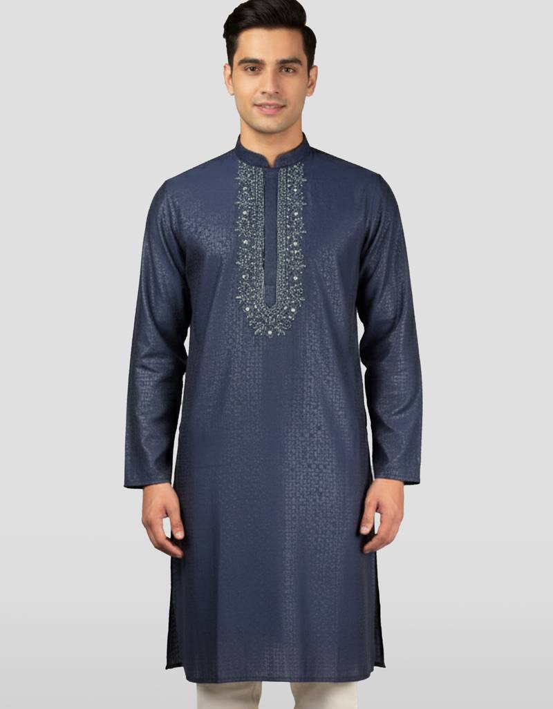 Vastramay men's navy blue zudio emboss silk kurta - bead mirror embroidered wedding