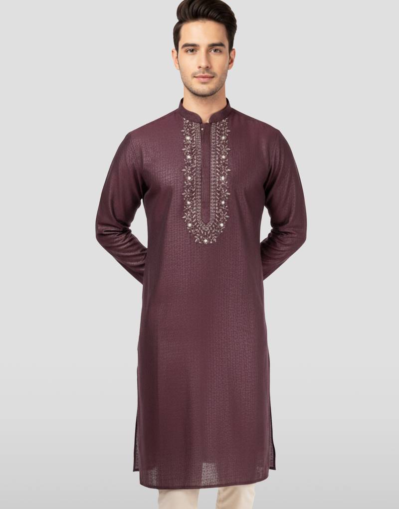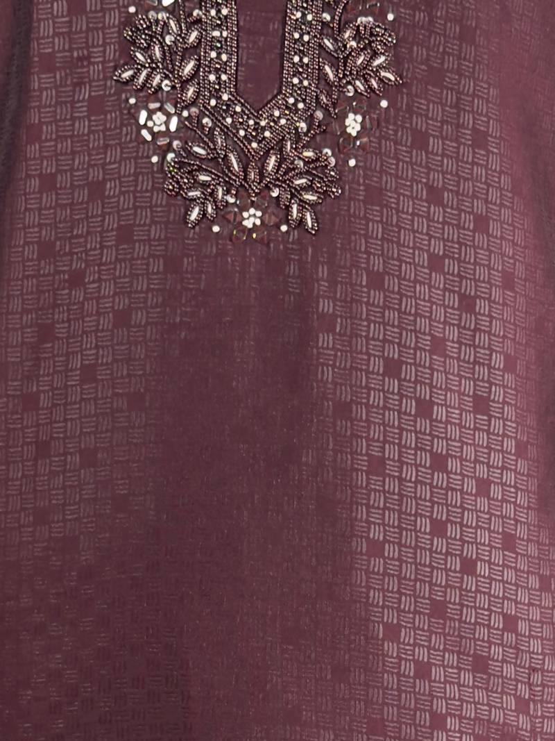 | Product Description | Elevate Your Festive Collection With Vastramay's Wine Zudio Emboss Silk Kurta Featuring Exquisite Bead And Mirror Embroidery In Floral Motifs With Premium Crepe Lining. |