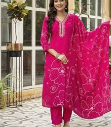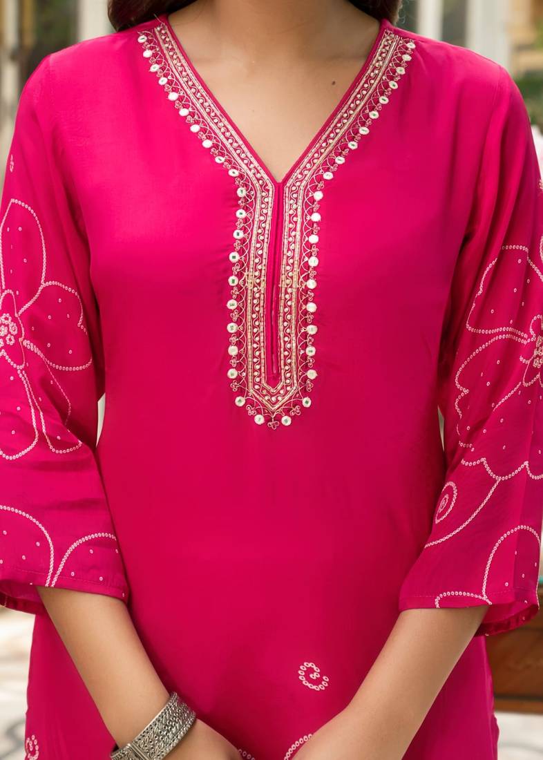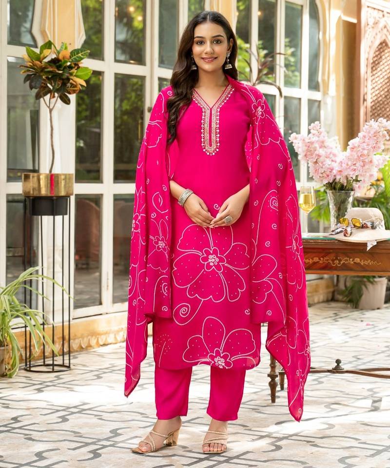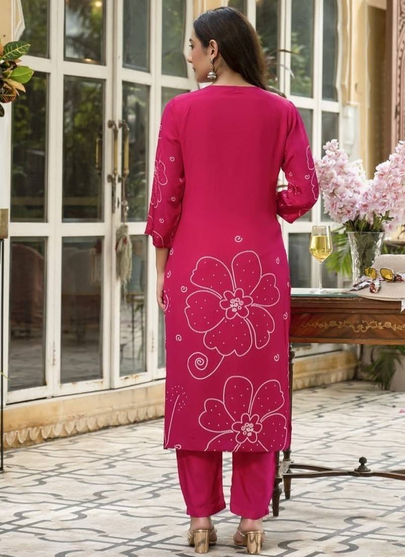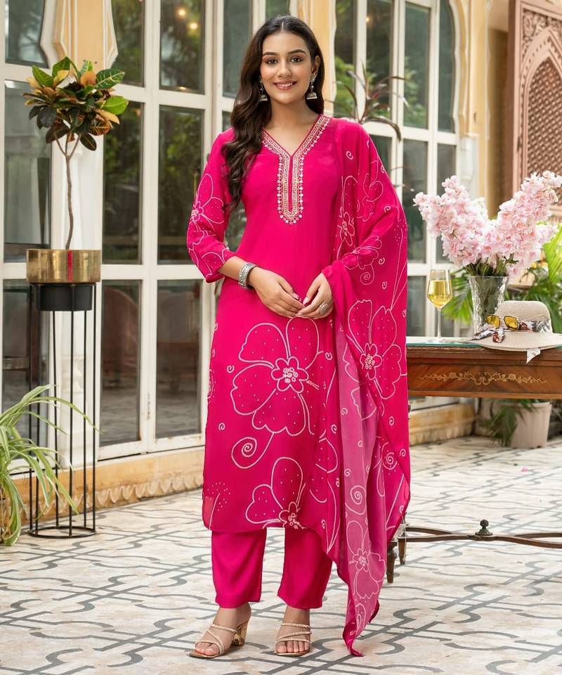 | Product Description | Pink Color Digital Printed Kurta With Trousers & Dupatta, Straight Calf Length Kurta & Straight Hem, Has A V Neck, Three Quarter Regular Slevees,