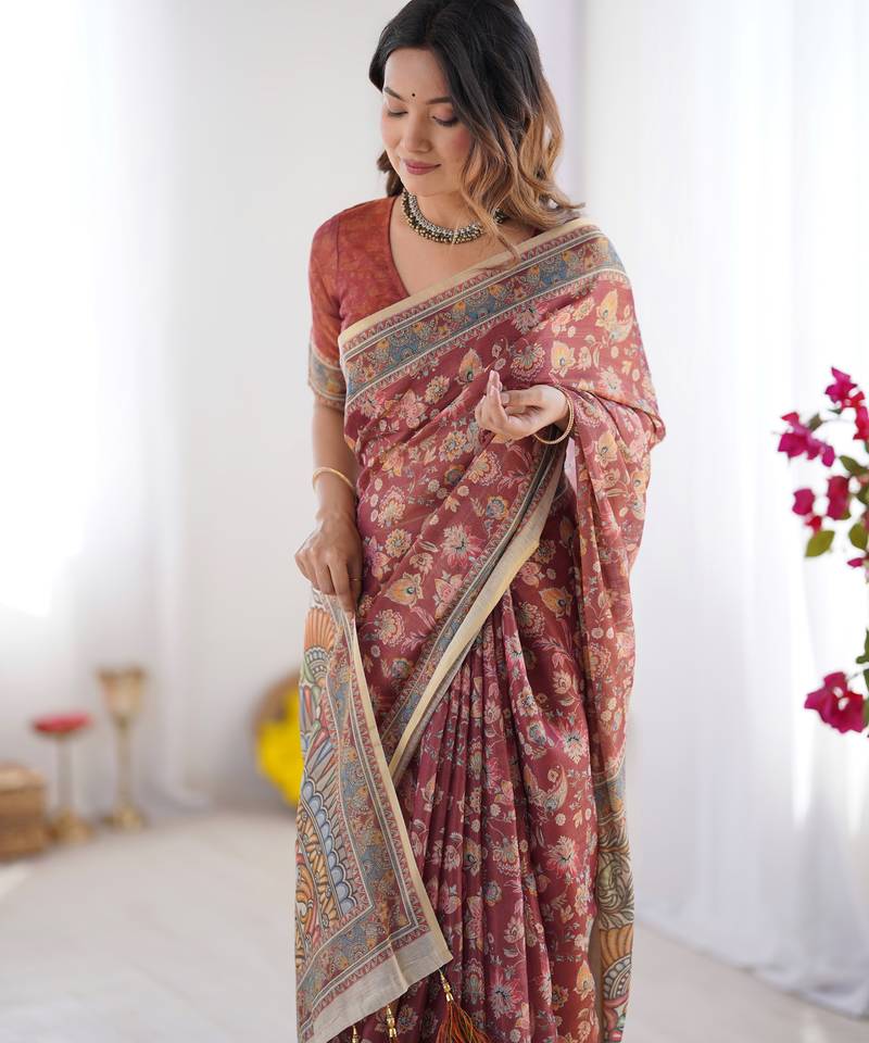 | Product Name | Rust Maroon Handloom Cotton Saree With Floral Jaal & Multicolor Mandala Pallu Art | |