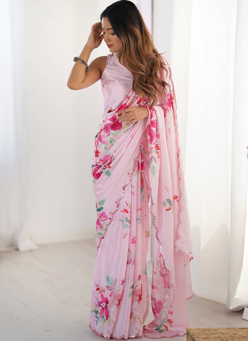 Baby pink chinon silk blend print work with mirror work border designer saree