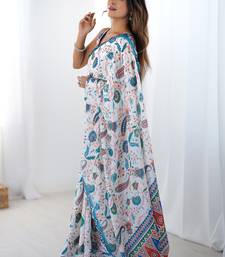Off white sky blue chinon silk blend print work with mirror work border designer saree