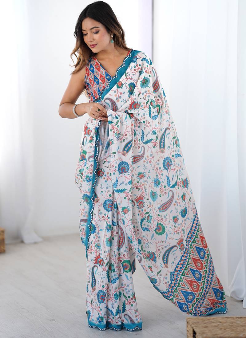 | Product Name | Off White Sky Blue Chinon Silk Blend Print Work With Mirror Work Border Designer Saree | |