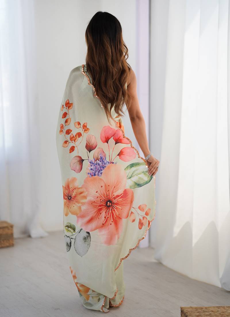 | Product Name | Olive Green Chinon Silk Blend Print Work With Mirror Work Border Designer Saree | |