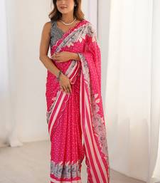 Pink chinon silk blend print work with mirror work border designer saree