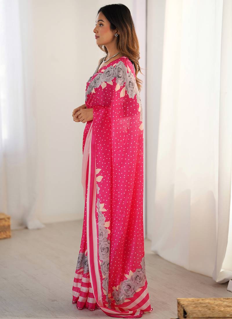 | Product Name | Pink Chinon Silk Blend Print Work With Mirror Work Border Designer Saree | |